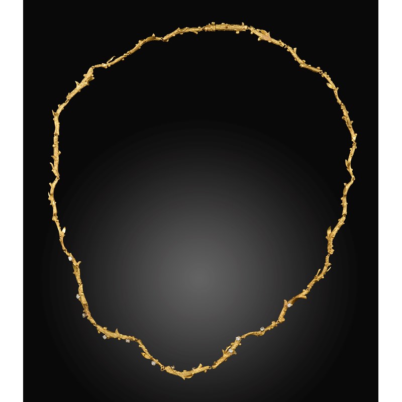 A gold and diamond necklace, 1970s, composed of branches in textured gold, set with brilliant-cut diamonds, length 58cm