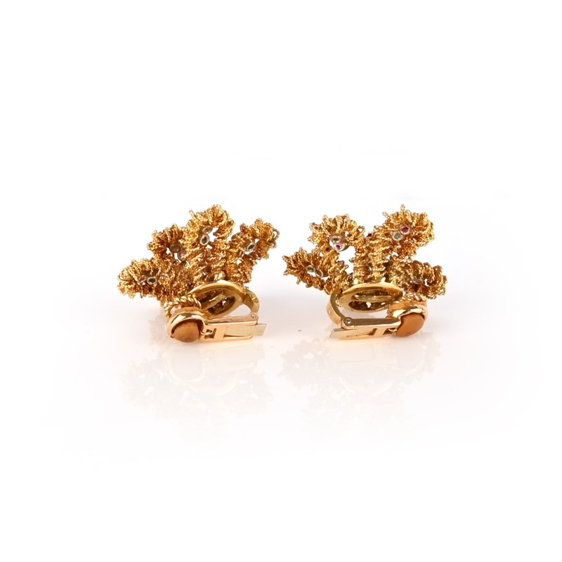 A pair of French gem-set gold earrings, set with rubies, sapphires, emeralds and diamonds within gold twisted rope surround, clip fittings, 2.7cm high