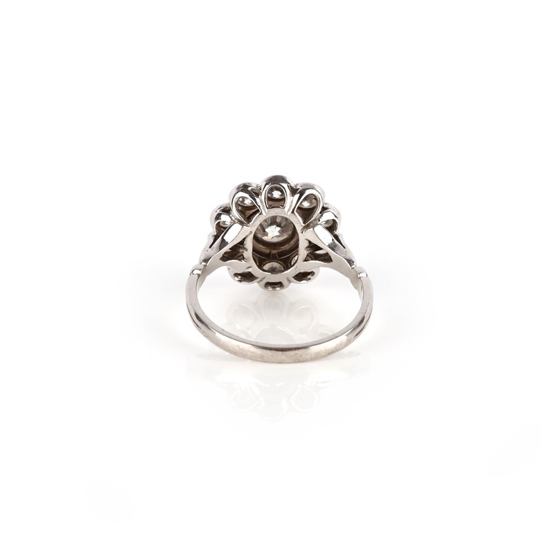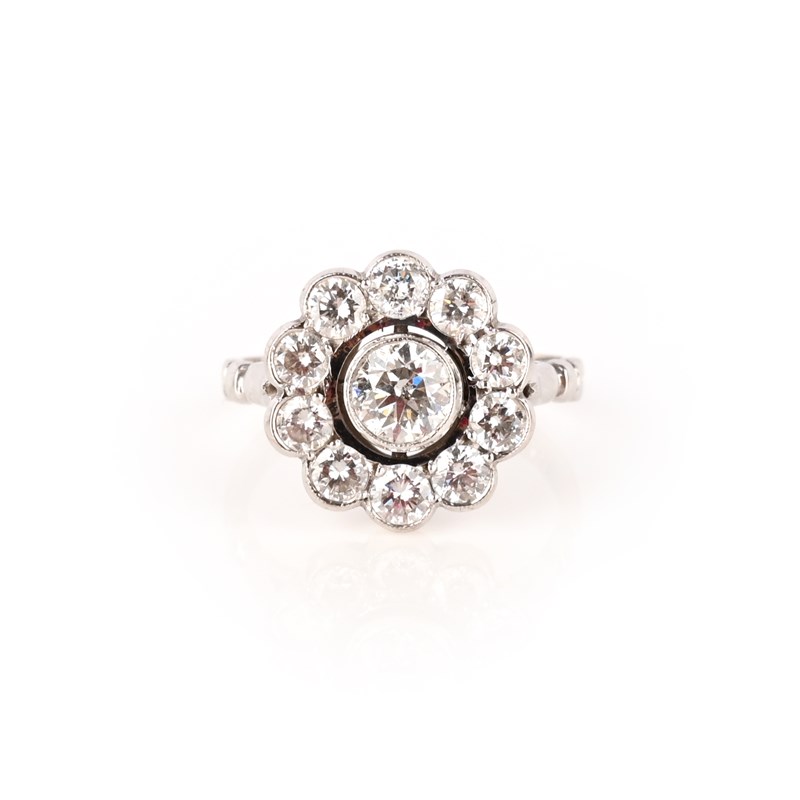 A diamond cluster ring, set with a central round brilliant-cut diamond within a border of 10 smaller round brilliant-cut diamonds in white gold, size P