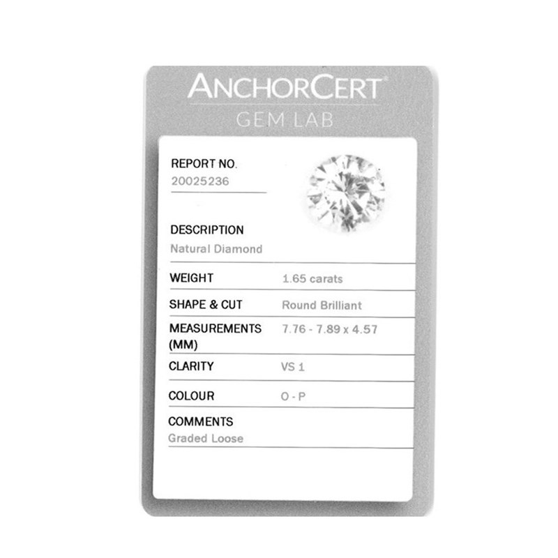 Accompanied by Anchor Cert report no. 20025236, stating that the diamond weighing 1.65 carats is O-P colour, VS1 clarity