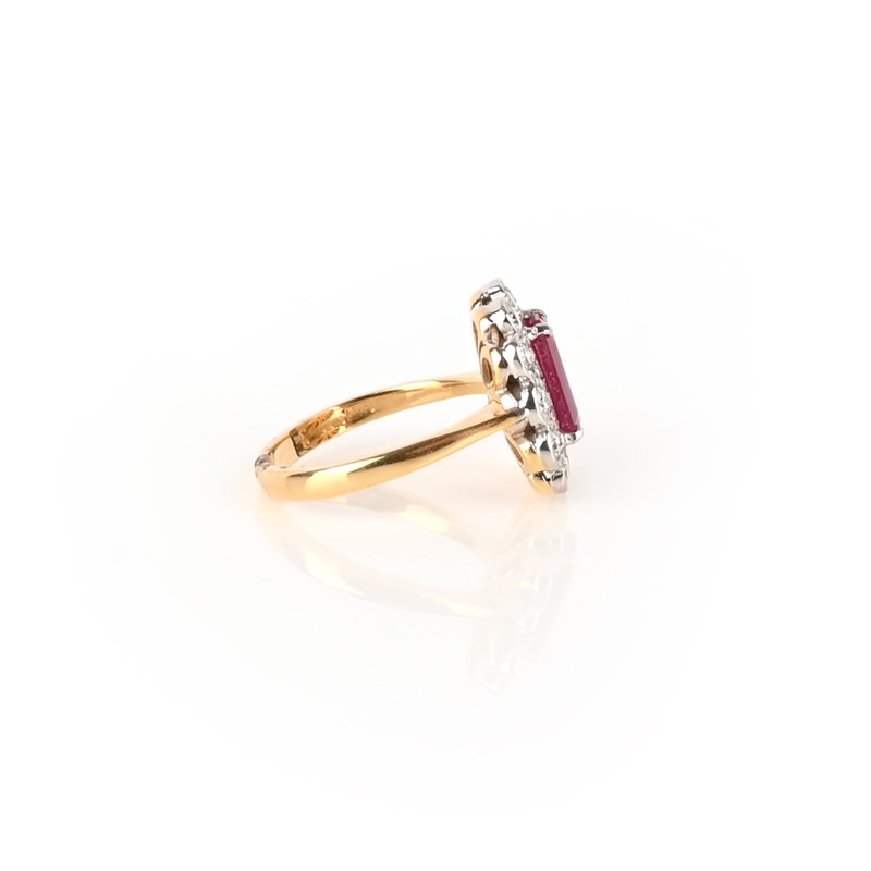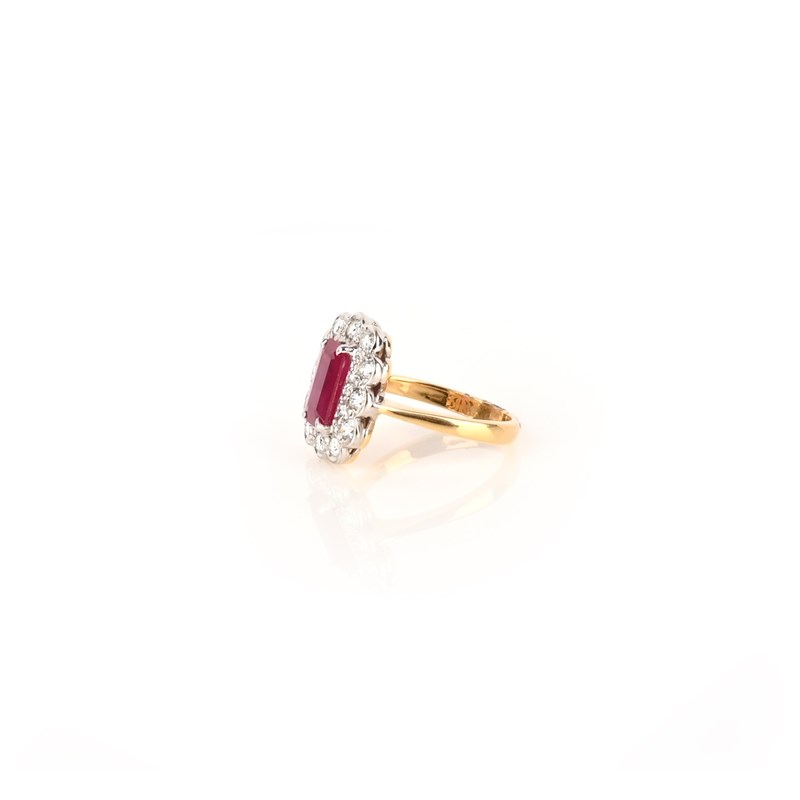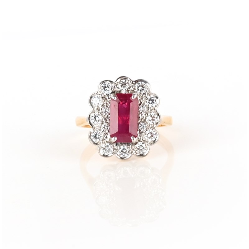 A ruby and diamond cluster ring, claw-set with a step-cut ruby within a border of brilliant-cut diamonds, size P, British hallmarks for 18ct gold