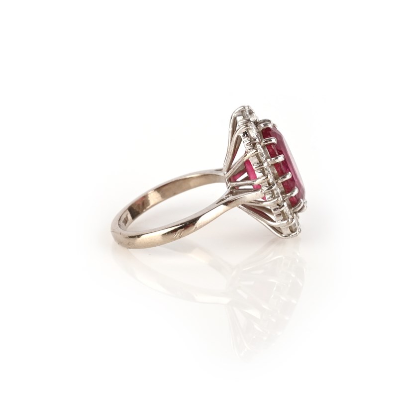 A tourmaline and diamond cluster ring, the oval tourmaline set within a surround of round brilliant-cut diamonds in white gold, size L
