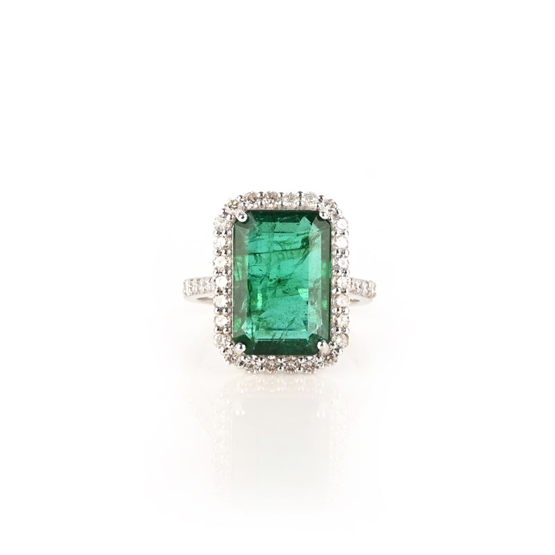 An emerald and diamond ring, claw-set with a step-cut emerald weighing 6.05 carats, within a border of brilliant-cut diamonds weighing a total of 0.86 carats, mounted in white gold, size N1/2