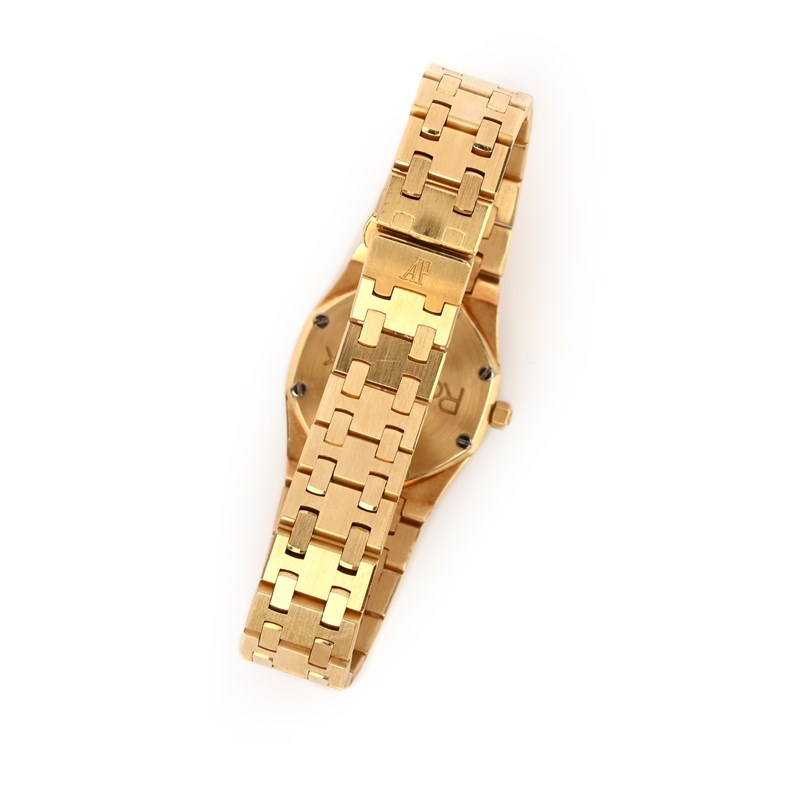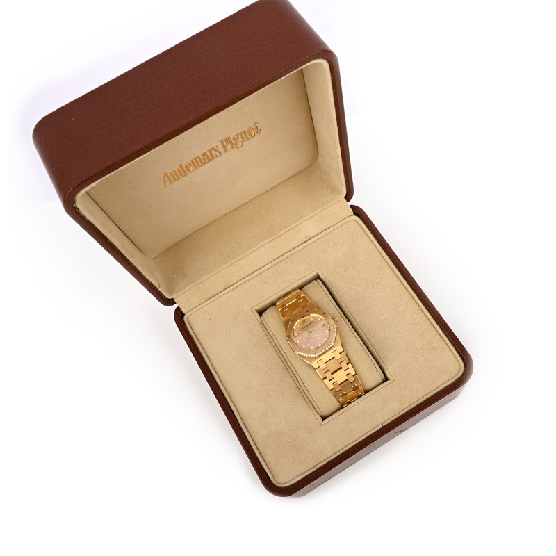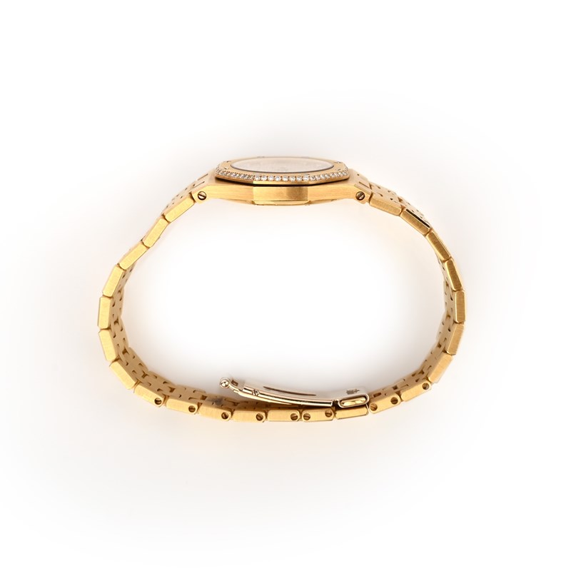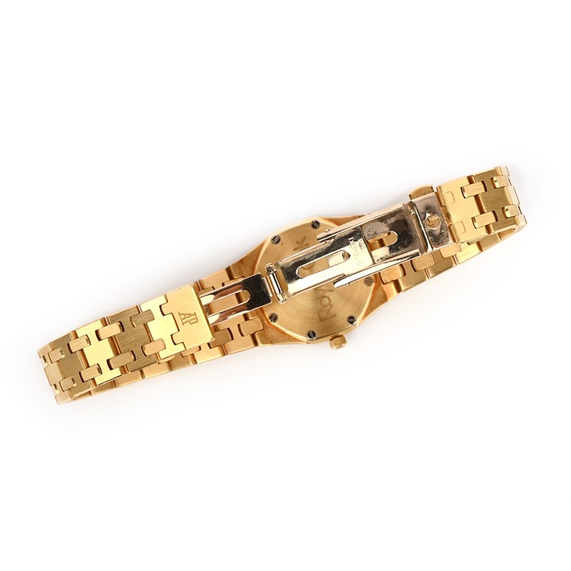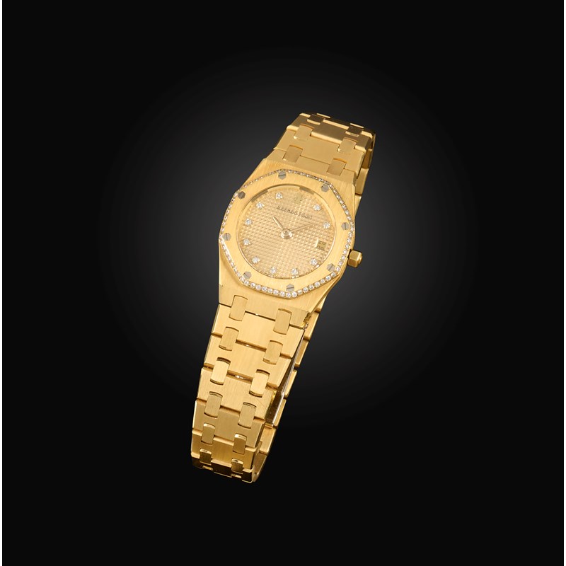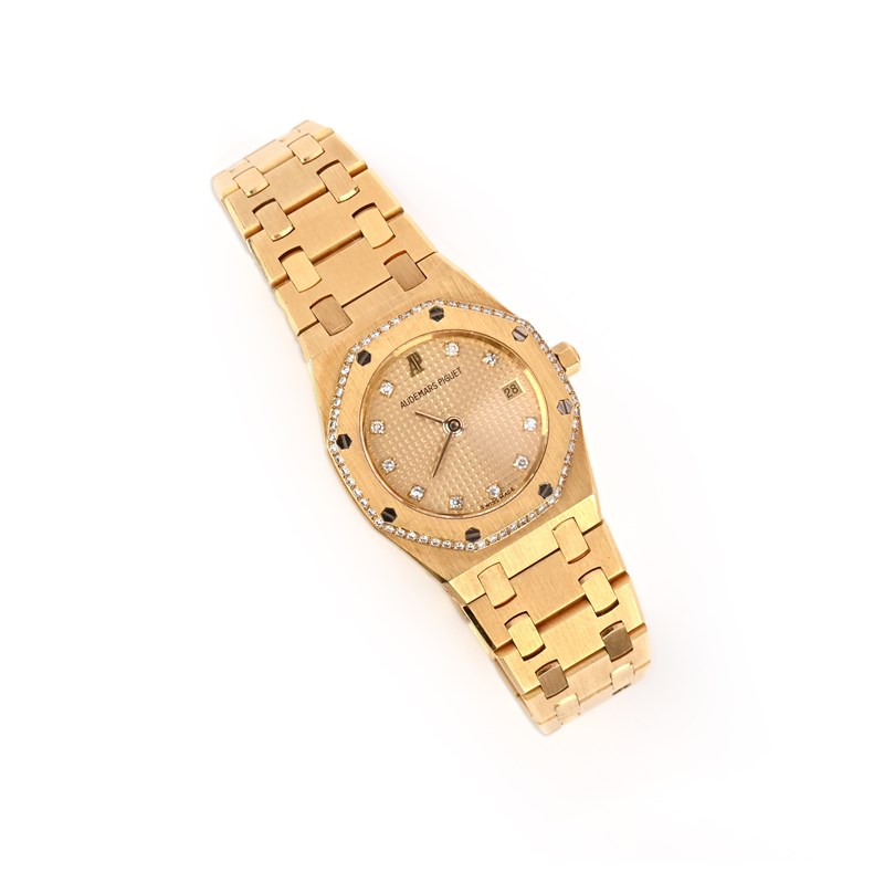 Audemars Piguet, a lady's 18ct gold and diamond wristwatch, 'Royal Oak', the gold face with a square grid design, with gold hands, diamond indicators and date wheel aperture, within an octagonal bezel with screw motifs and bordered with brilliant-cut diamonds, to a gold link bracelet with deployant clasp, dial 1.7mm diameter, inner circumference 16cm, quartz movement, signed Audemars Piguet, inscribed Royal Oak, No443, European convention marks for 18ct gold, fitted case stamped Audemars Piguet