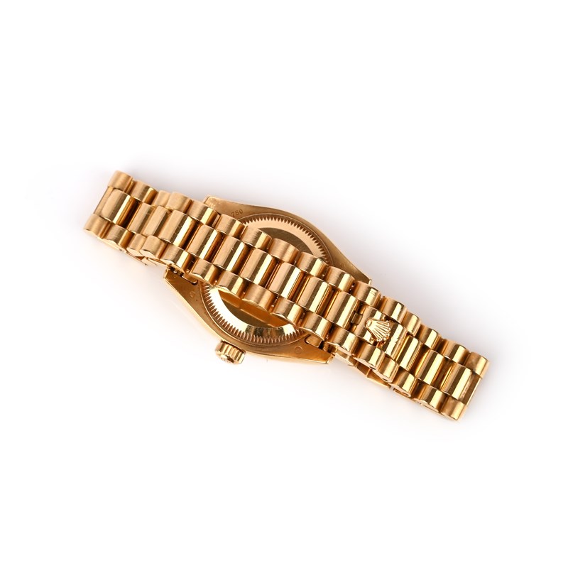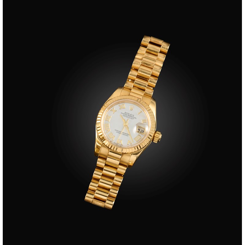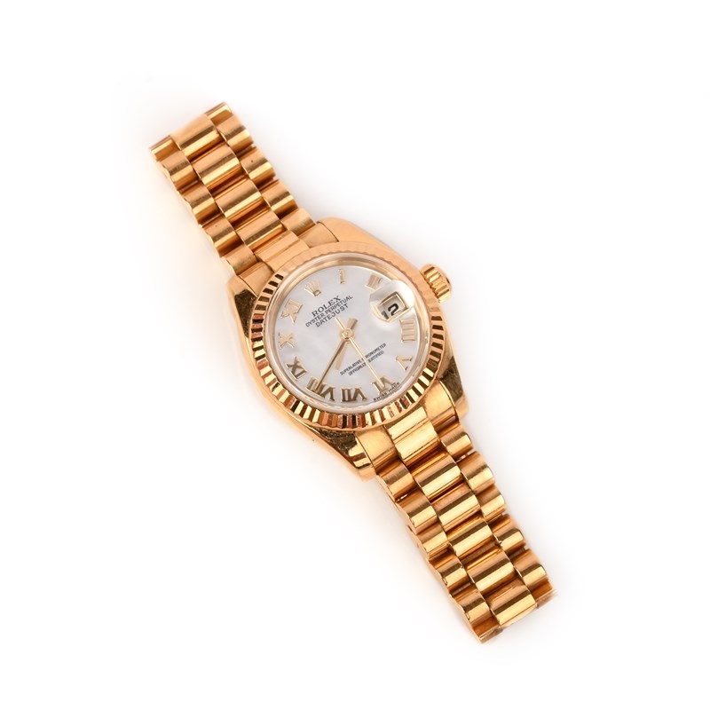 Rolex, a lady's gold DateJust wristwatch, signed mother of pearl dial with Roman numerals and date aperture, sweep seconds hand, oyster perpetual automatic movement, on president-link bracelet, case 2.7cm wide, numbered K830536 and 179178, original box and papers