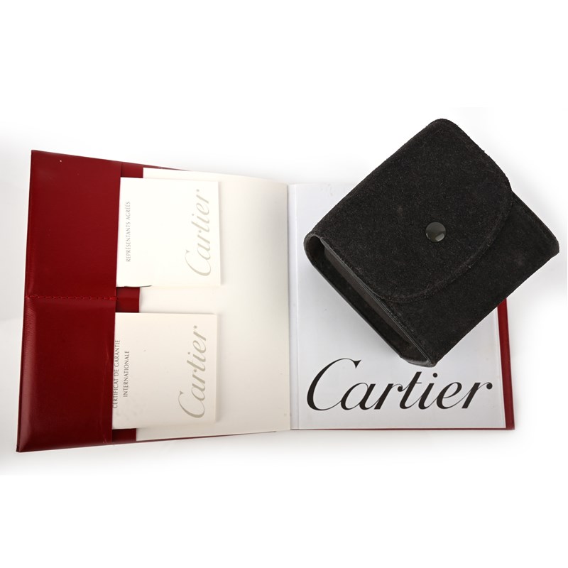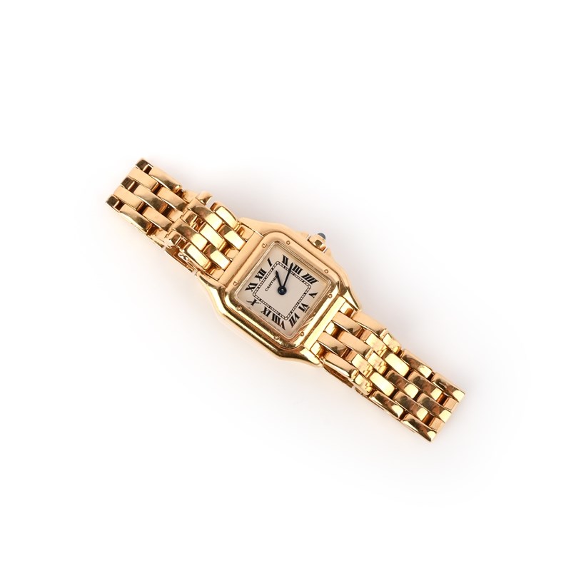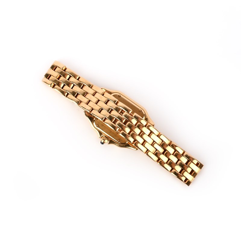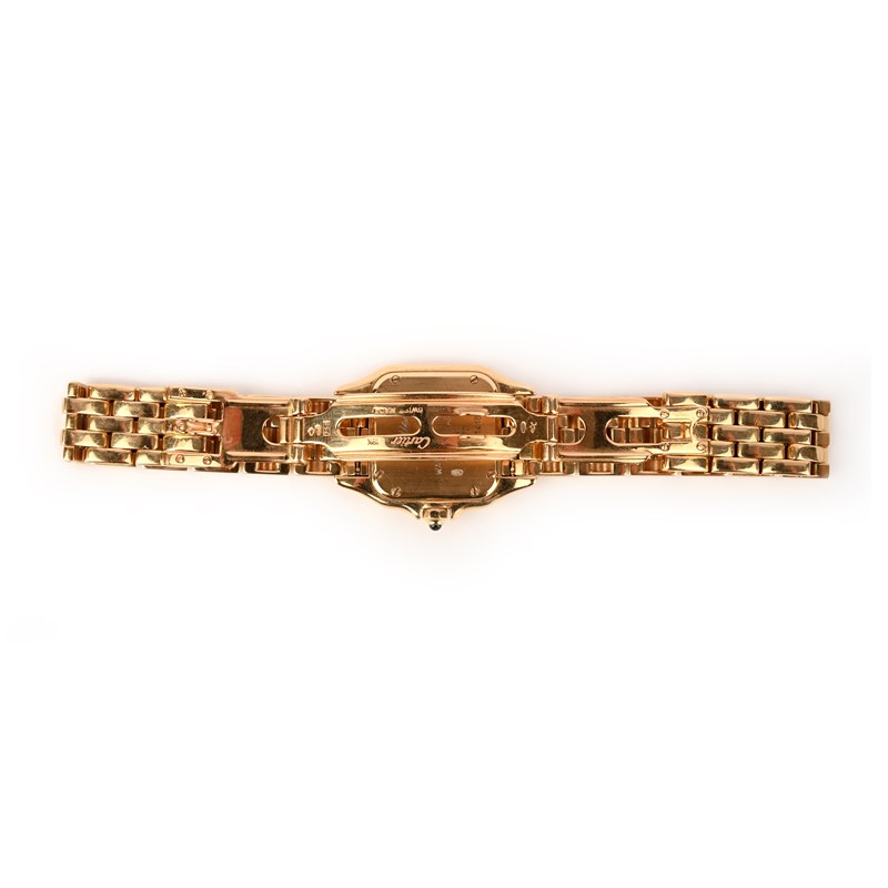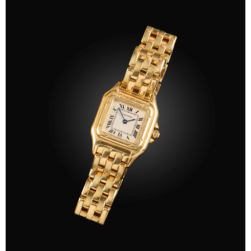 Cartier, a lady's 18ct gold wristwatch, 'Panthère', circa 2002, the square white enamelled dial with black Roman numeral indicators and blued steel hands, to a gold bezel and integrated link bracelet with double deployant clasp, dial 1.3 x 13cm, bracelet 16cm, signed Cartier, secret signature on dial at X, case back numbered 1070 and MG281418, Swiss and European convention marks for 18ct gold, Cartier case and guarantee booklet