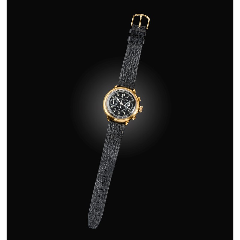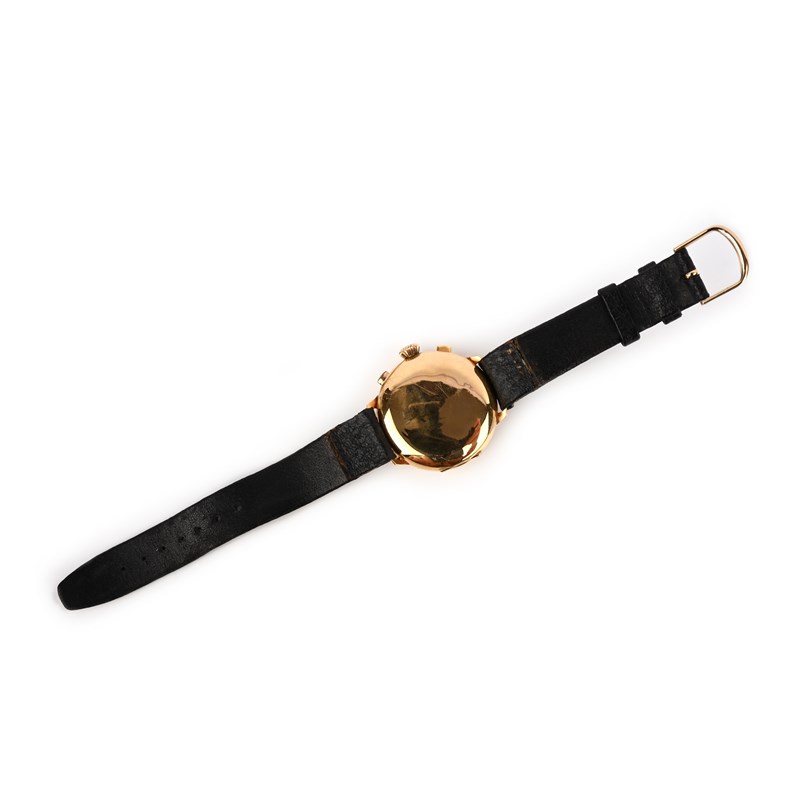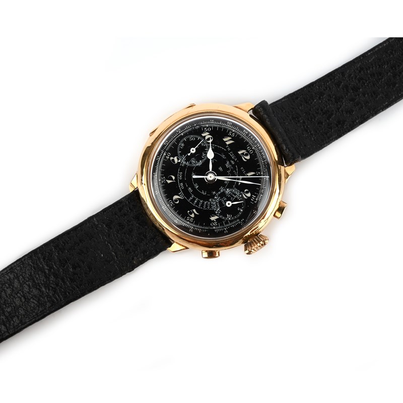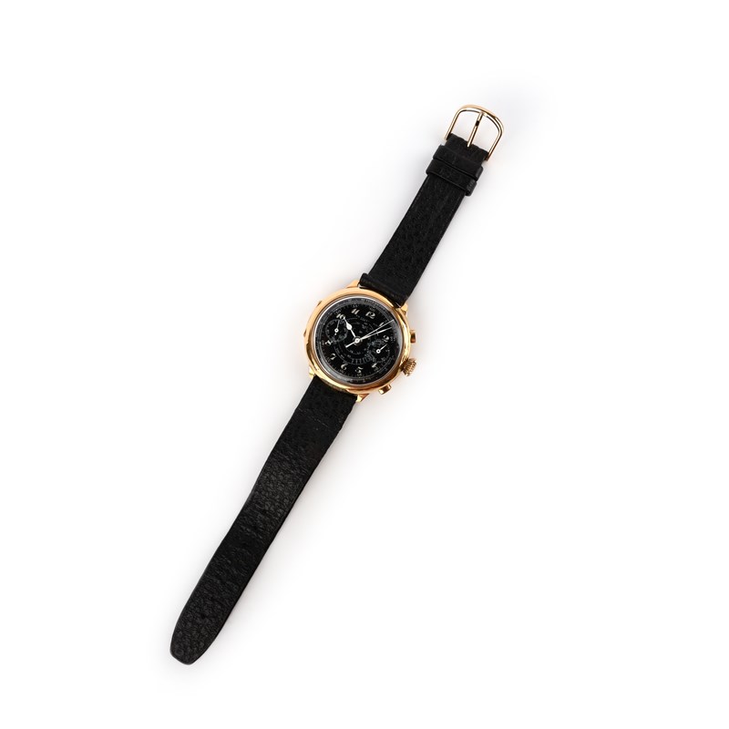 TH Picard et Fils, a gold chronometer wristwatch, 'La Chaux-de-Fonds', mid 20th century, the black enamelled dial with subsidiary seconds and half hour dials, with white enamelled hands, to a gold case with winder and two buttons for stopwatch function, to a later black leather strap, dial 3.2cm diameter, manual winding movement, dial signed TH Picard et Fils, La Chaux-de-Fonds', the top inscibed 'Telemetre' case and interior of case back with Swiss assay marks for 18ct gold, numbered 224403