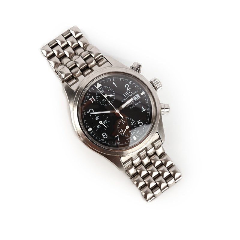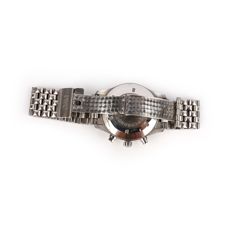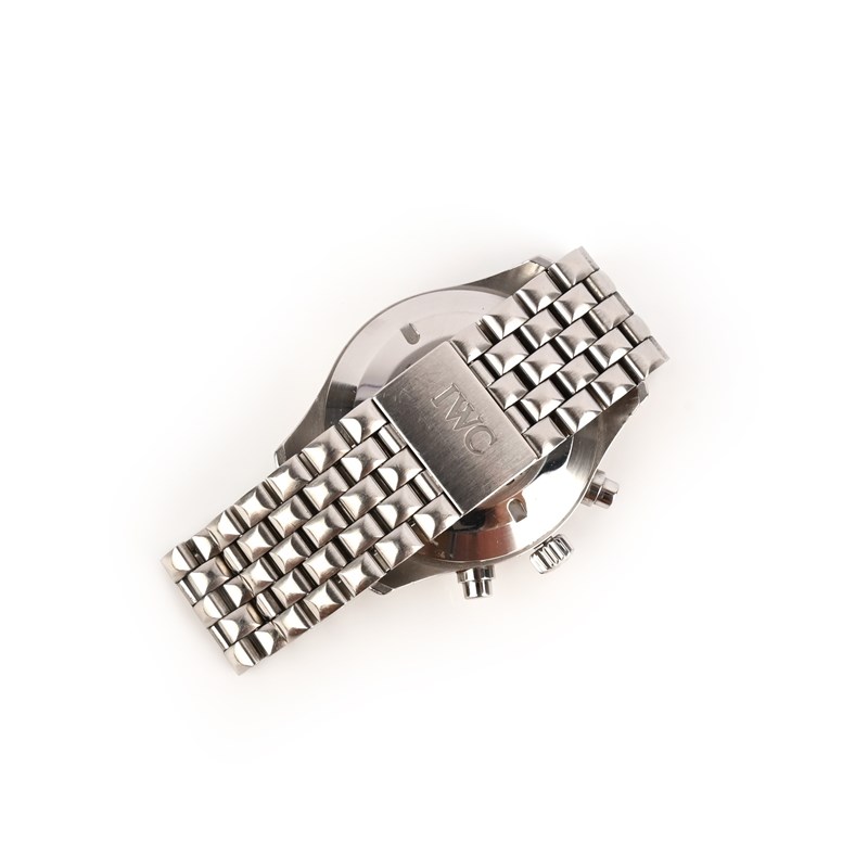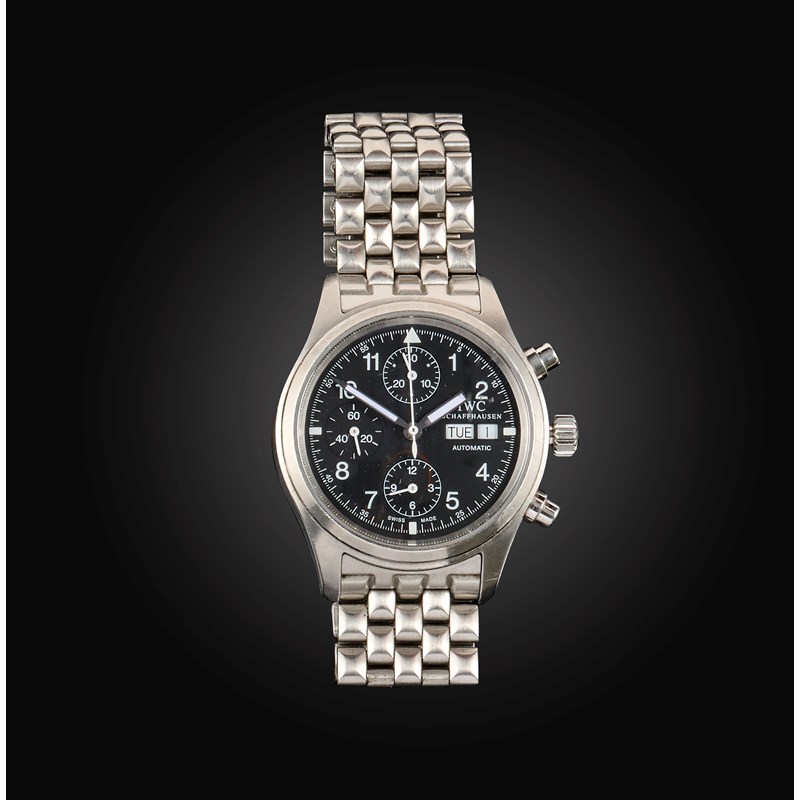 IWC, a gentleman's stainless steel wristwatch, 'Fliegerchronograph Day Date Automatic', IW370607, circa 2015, the circular black chronograph dial with subsidiary dials, white enamel hands and indicators and day and date wheel apertures, to a plain stainless steel bezel and link bracelet with deployant clasp, dial 3.3cm diameter, automatic movement, dial clasp and case back signed IWC, case back numbered 2765166, accompanied by fitted case, facsimile of invoice dated 2015, and servicing documents dated 2017