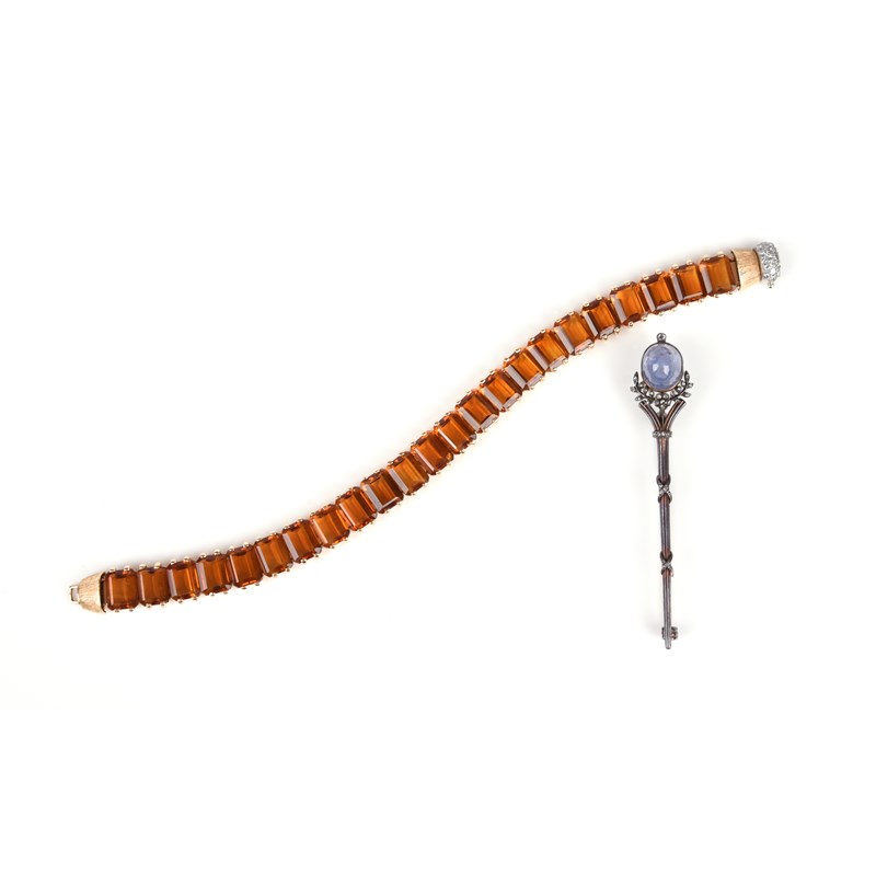 A citrine and diamond bracelet, mounted with twenty-three deep orange emerald-cut citrines in articulated mounts, with small diamonds pave-set to the hinged clasp, 19cm, and an early 20th century fluted gold brooch with diamond-set ties supporting a cabochon star sapphire above a diamond-set laurel, 7.3cm