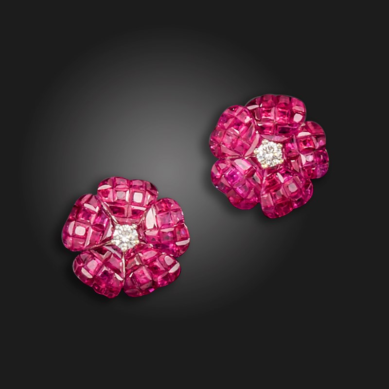 A pair of ruby flowerhead earrings, the petals invisibly-set with calibre-cut rubies and centred with a round brilliant-cut diamond in white gold, 1.4cm wide