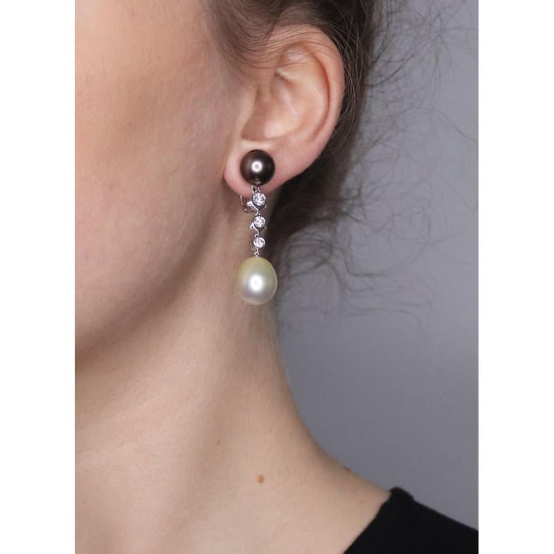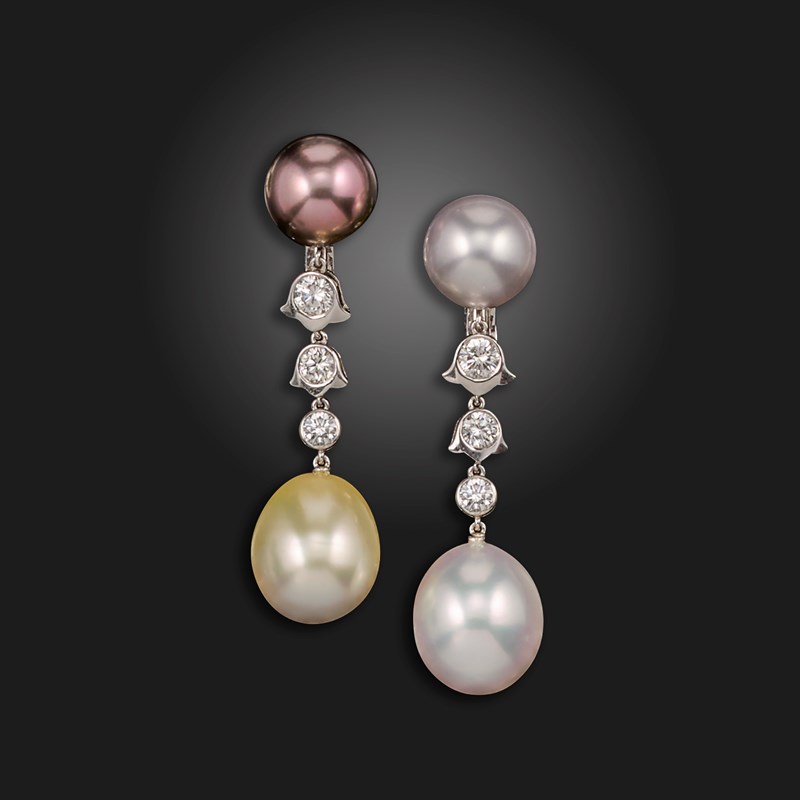 A pair of cultured pearl and diamond drop earrings by Cartier, set with vari-coloured cultured pearls the articulated drops set with graduated round brilliant-cut diamonds in platinum and white gold, diamonds approximately 0.75cts total, each signed Cartier, JC, French control mark, London marks for platinum, inventory number 943067, clip fittings, 4.5cm high