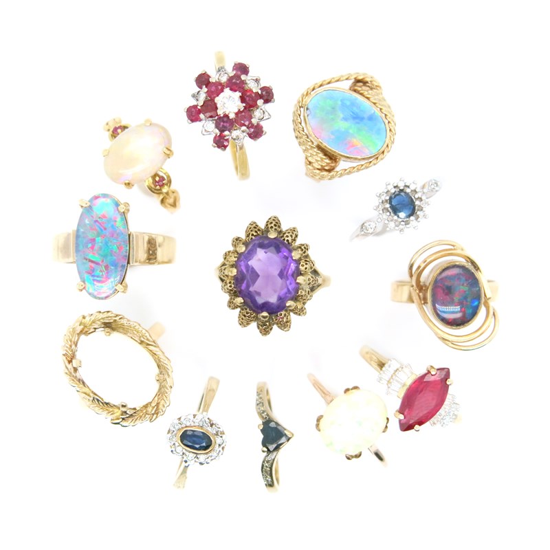 Twelve gem-set gold rings, including an opal cabochon-mounted gold ring, a ruby and diamond cluster ring, and various other gem-set gold rings