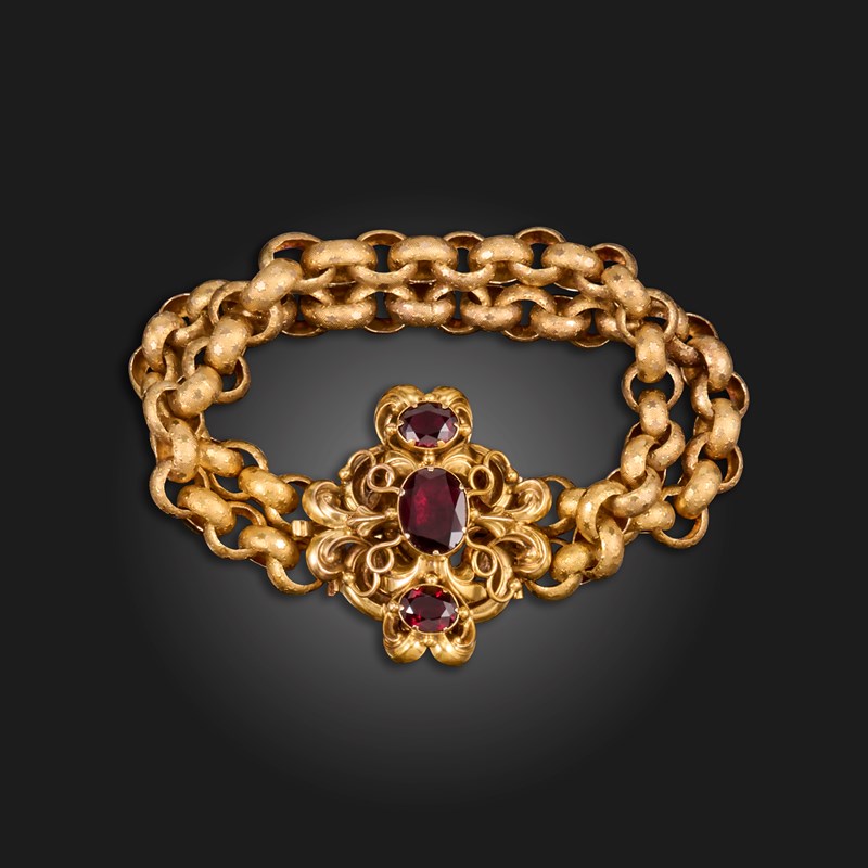 An early 19th century garnet gold bracelet, the scrolling repoussé clasp set with three oval-shaped garnets, the circular links with textured decoration and star motifs, 18cm long, 26g
