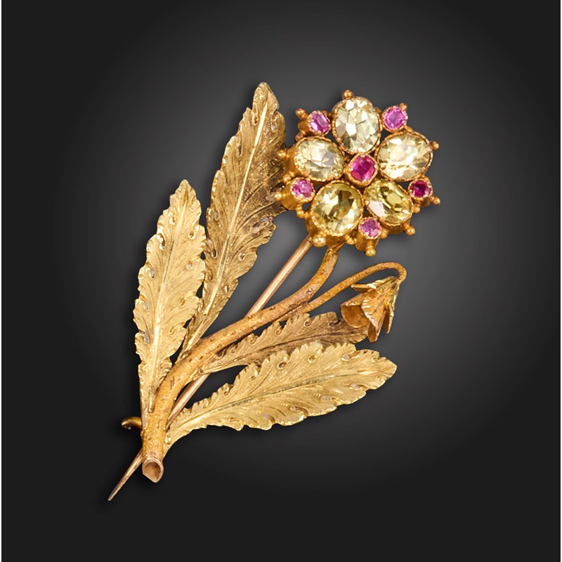 A Regency gold flower brooch, the flowerhead set with chrysolites and rubies in two-colour gold, 4.6cm high