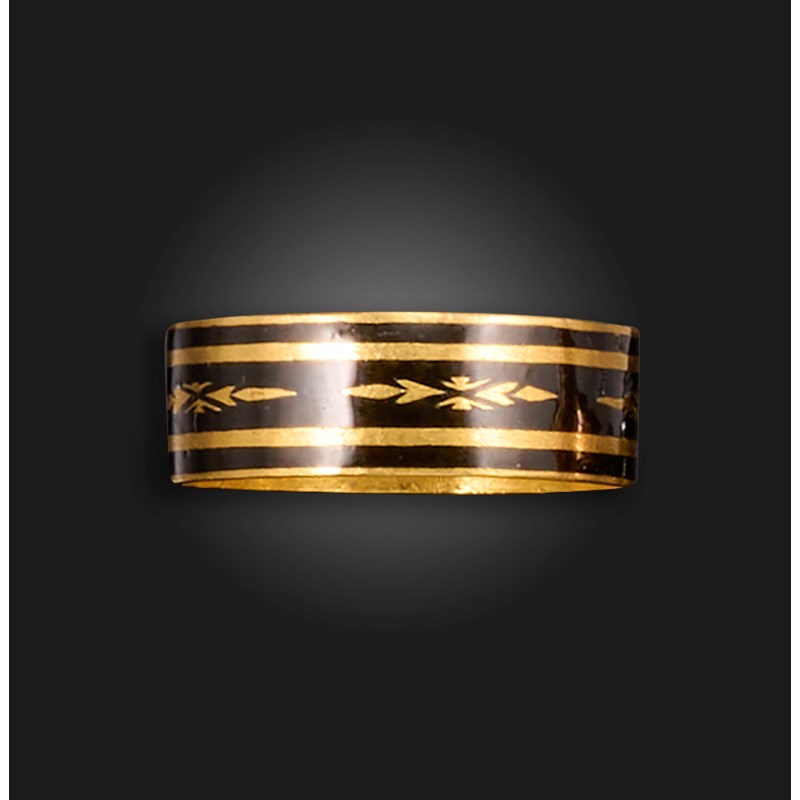 A late 18th century gold mourning ring, the gold band with black enamel decoration, interior mourning inscription dated 1793 and inscribed 'Weep not for me but prepare to follow', duty mark, lion passant and maker's mark L&R (possibly for John Langlands I and John Robertson I), size R