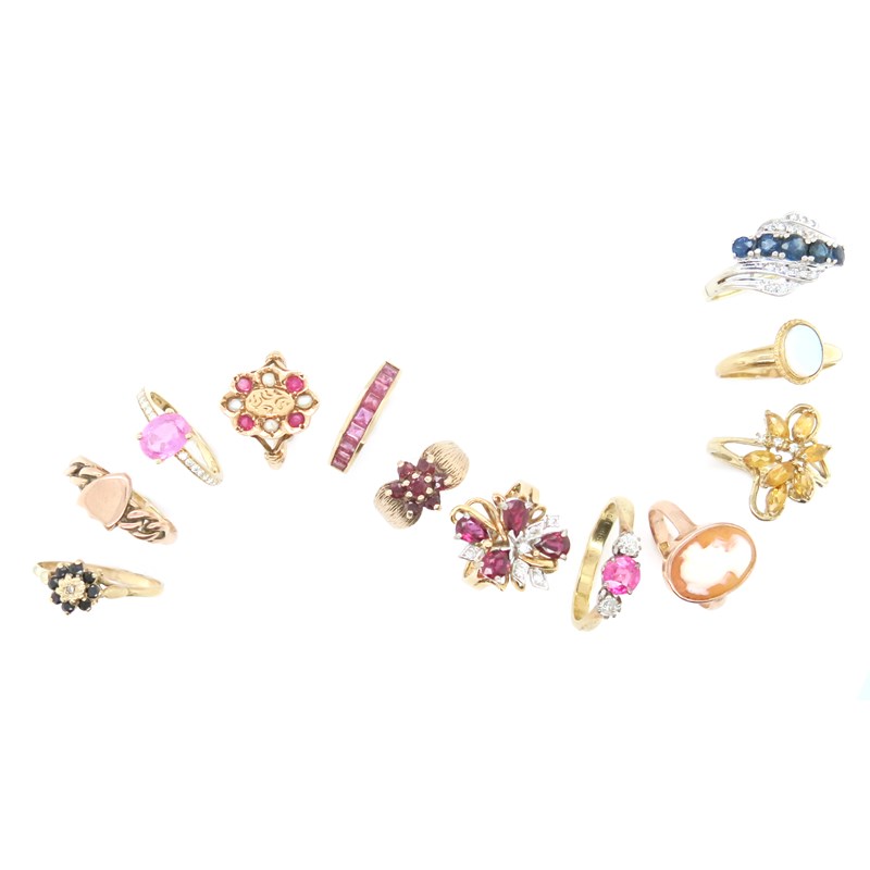 Twelve gem-set rings, including; a ring set with a pink sapphire between circular-cut diamond shoulders, a 9ct gold hallmarked ring channel-set with calibre-cut rubies and ten other gem-set rings, various sizes