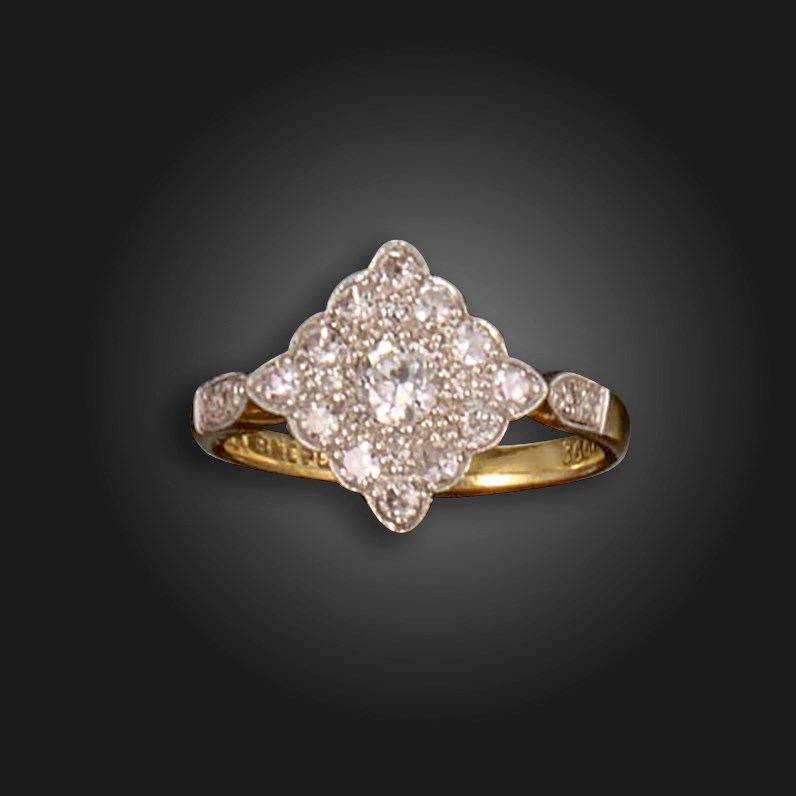 A diamond cluster ring, the lozenge-shaped ring head pavé-set with single-cut diamonds, with further diamonds to the shoulders in platinum on gold, size M