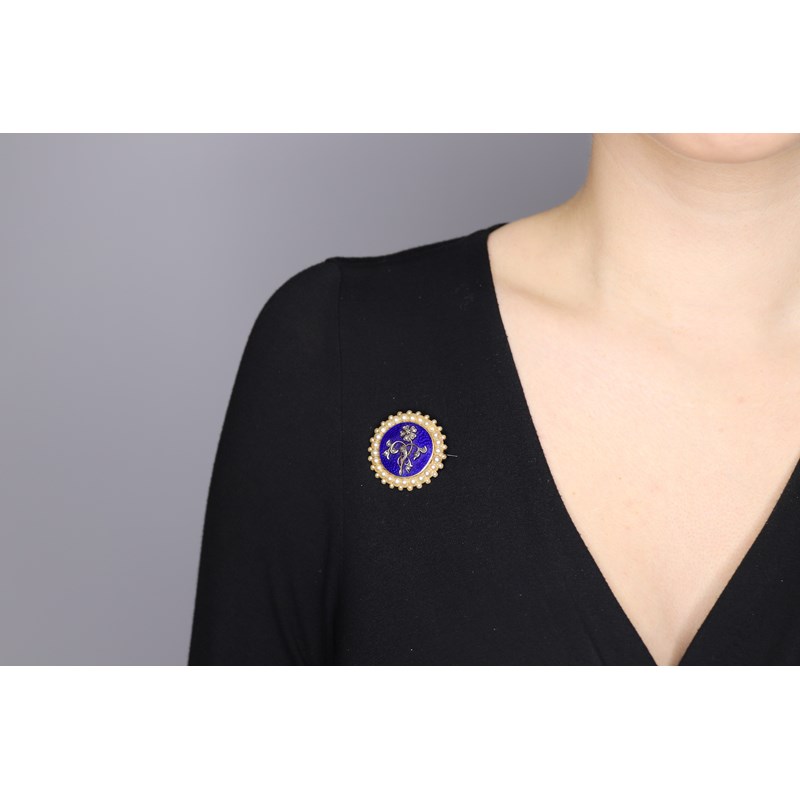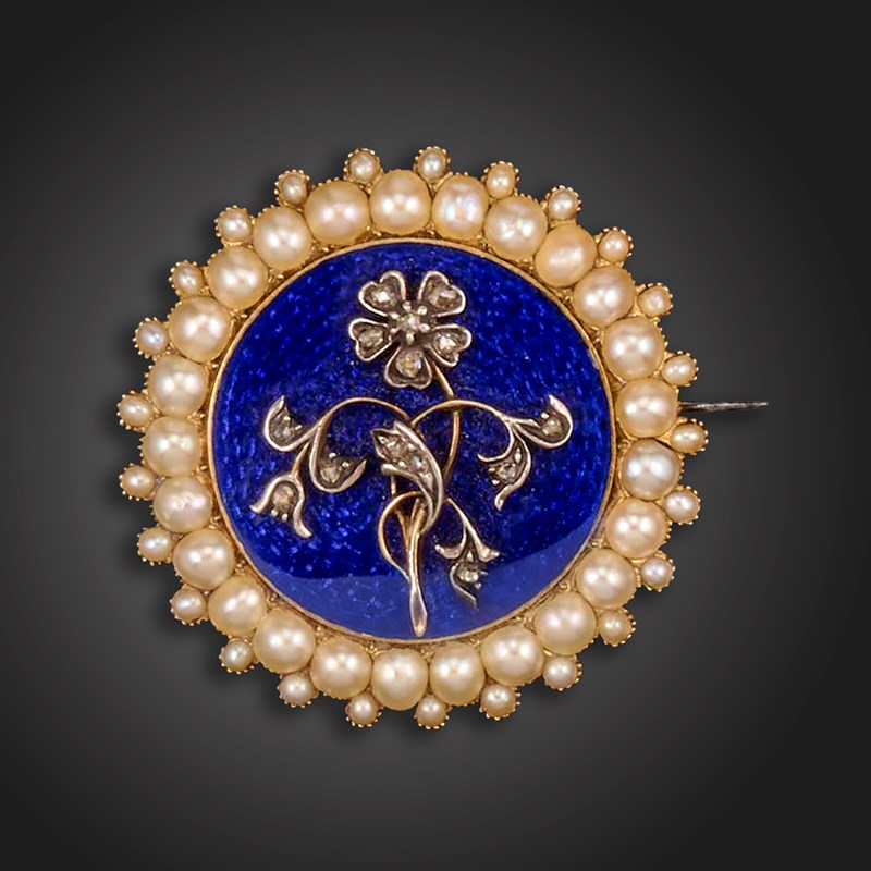 An early Victorian circular mourning brooch, the diamond set forget-me-not on a blue enamel ground with a seed pearl border, engraved with inscription dated 1843, hinged and glazed locket compartment, 3.4cm