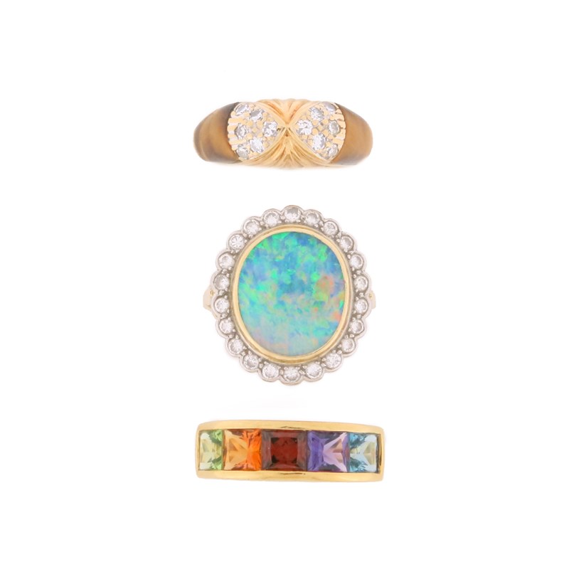 Three gem-set rings, a boulder opal and diamond cluster ring, set in gold, size L; a multi-coloured gem-set half hoop ring set in gold, size M, and a tapered gold ring with fluted decoration, set with tiger's eye and single-cut diamonds, size I