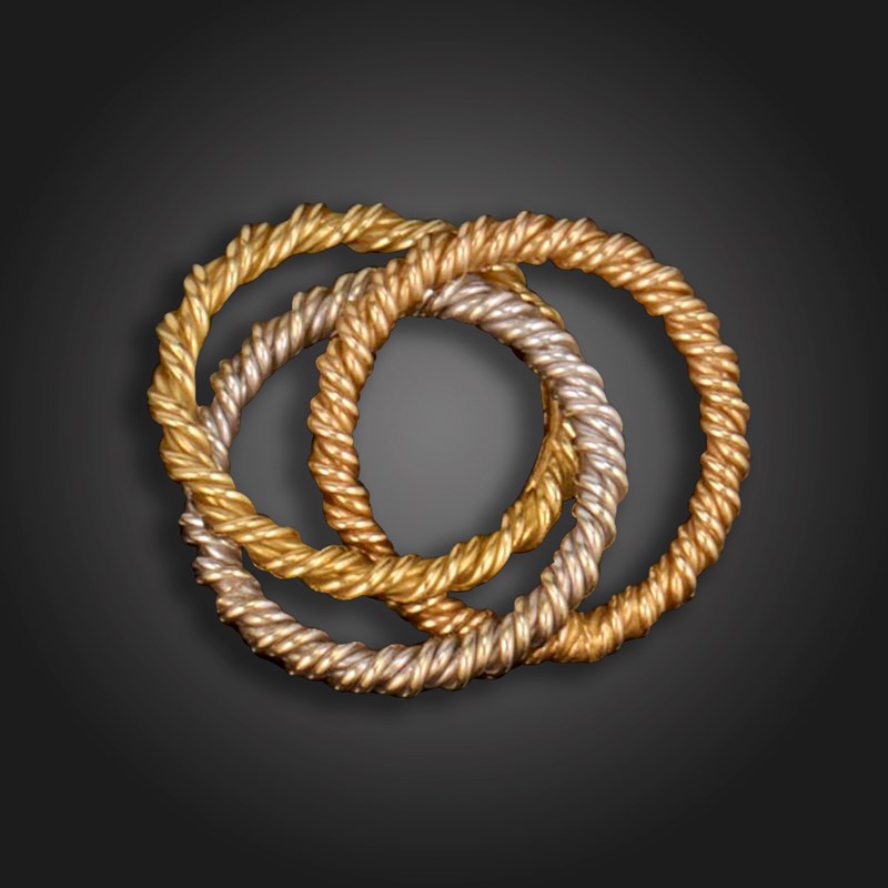 ‡ A gold trinity ring by Andrew Grima, the three entwined ropetwist hoops in 18ct three-colour gold, signed AGLtd, London hallmarks for 1978, size F