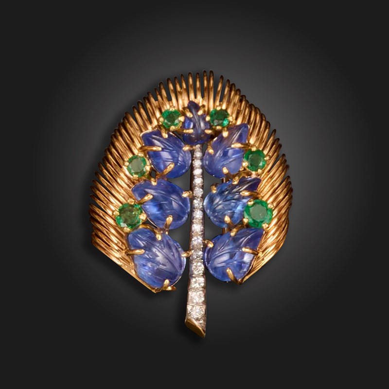 A French gem-set brooch, designed as a palmette, set with carved sapphires and graduated circular-cut emeralds, the stem set with circular-cut diamonds in gold, French control mark, stamped JW and 750, 3.5cm high