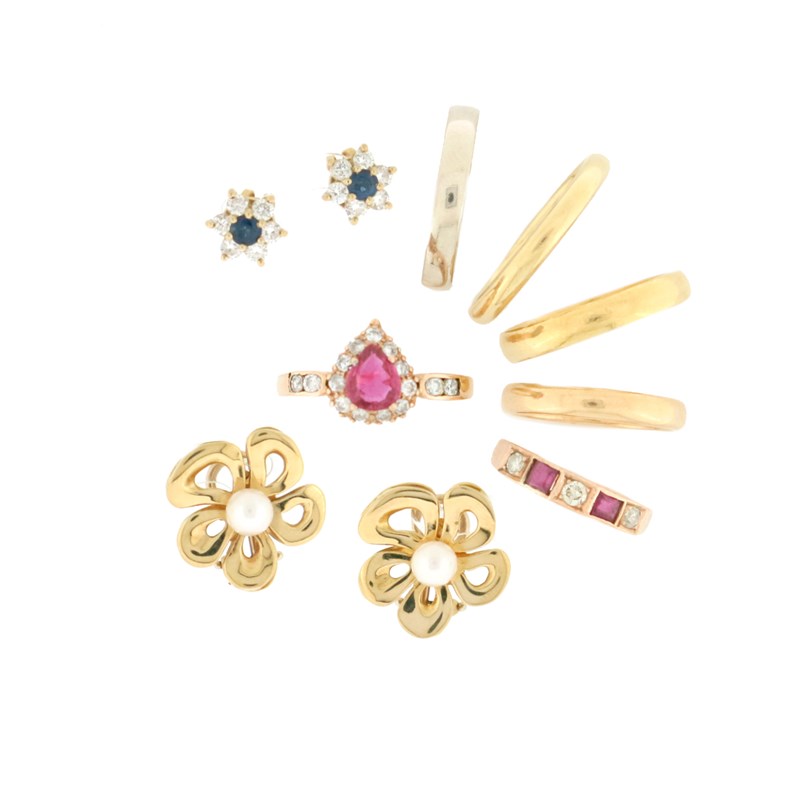A quantity of jewellery items, including four gold wedding bands, a ruby and diamond-set gold half-hoop ring, a pear-shaped ruby and diamond-set gold cluster ring, a pair of cultured pearl-set gold flower earrings, and a pair of sapphire and diamond cluster earrings