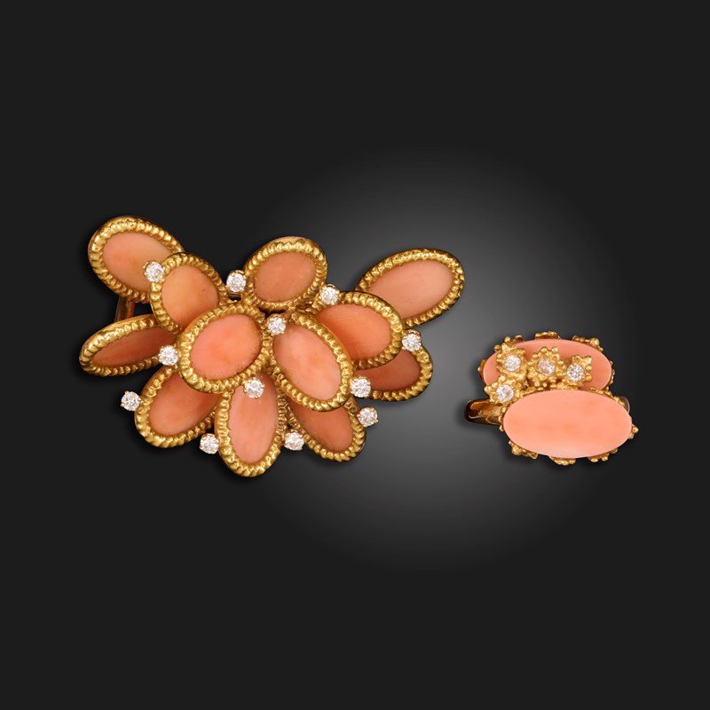 λ A coral and diamomd-set gold brooch and ring by David Morris