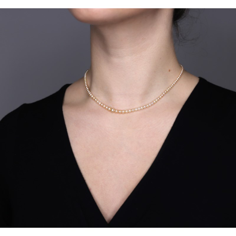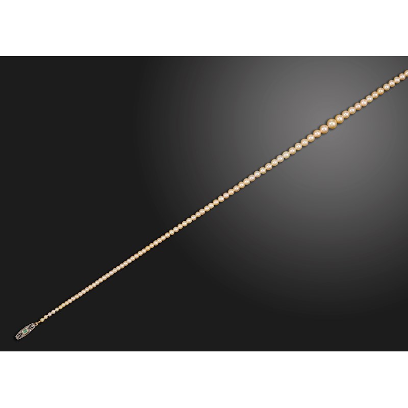 A single-row natural pearl necklace, the pearls graduate from 2.10 - 5.73mm, the cluster clasp set with an emerald and rose-cut diamonds in silver on gold, 40cm long, 7.2g