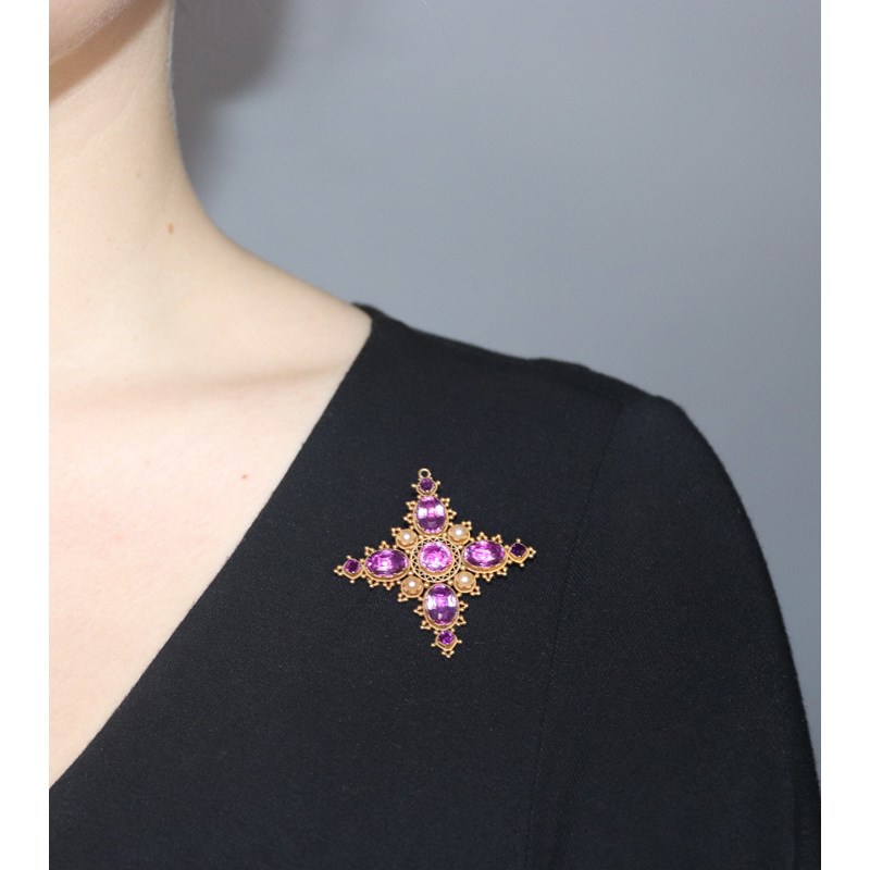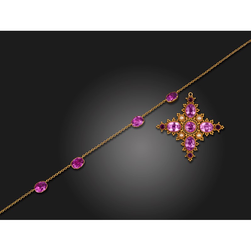 A Regency gem-set gold necklace, the cruciform pendant set with amethysts and seed pearls with pellet decoration in closed-back gold settings, on a fine-link gold neck chain set with four oval-shaped amethysts, pendant 4.8cm high, chain 36cm long
