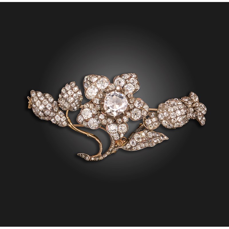 An early 19th century diamond-set foliate brooch, the centre diamond flowerhead cluster mounted 'en tremblant' and centred with a large asymmetrical circular-cut diamond in a cut-down collet, within a diamond-set pendant, further diamonds set to the leaves and flowerheads in silver and gold, detachable brooch fitting, 7cm wide, fitted case by S.J.Phillips, additional brooch fitting