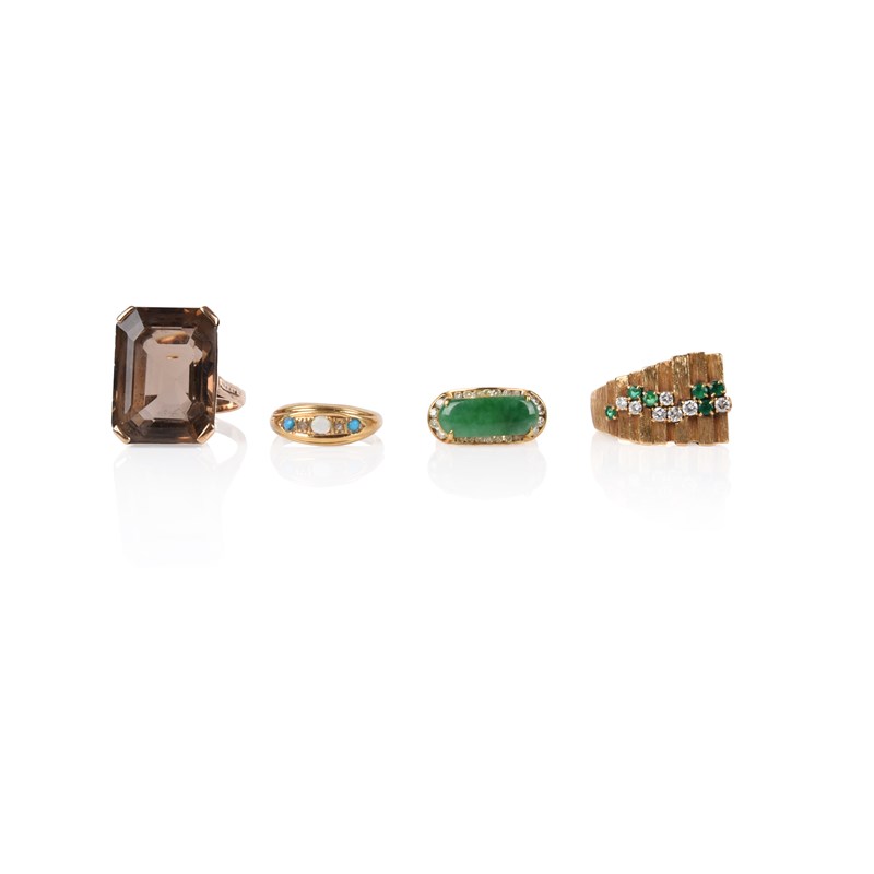 Four gem-set gold rings, one early 20th century half-hoop ring set with opal, turquoise and rose-cut diamonds in 18ct gold, Birmingham marks for 1919, maker's mark HWLtd, together with a smoky quartz-set gold ring, a jade and diamond-set gold ring, and a ring set with circular-cut emeralds and diamonds in textured gold
