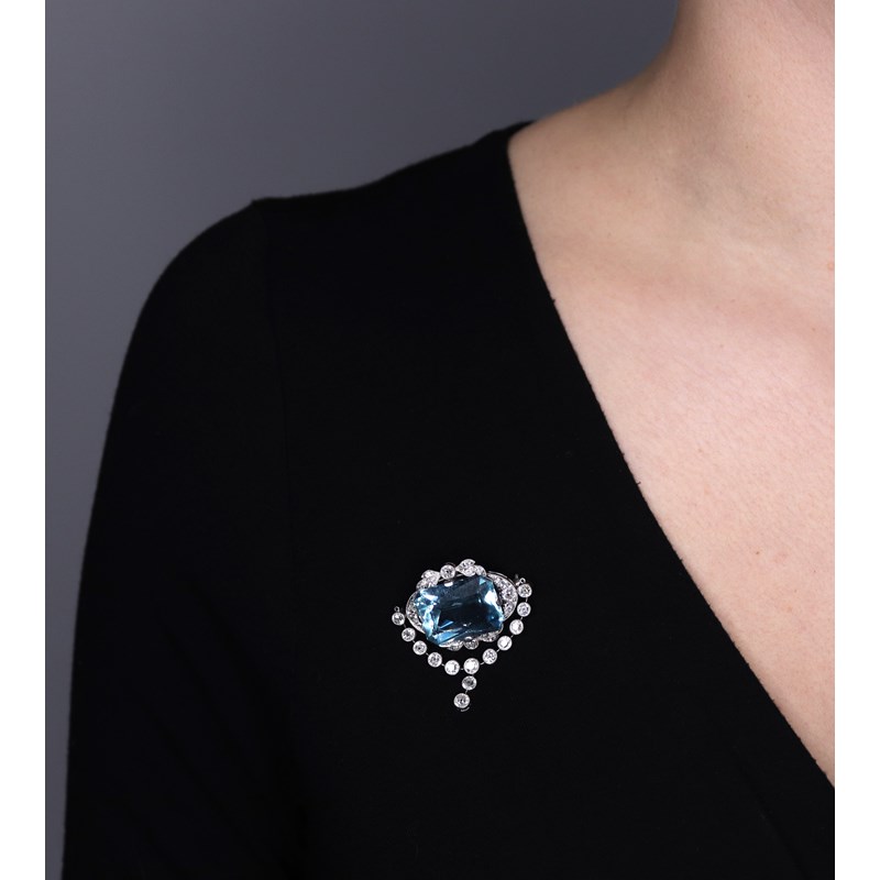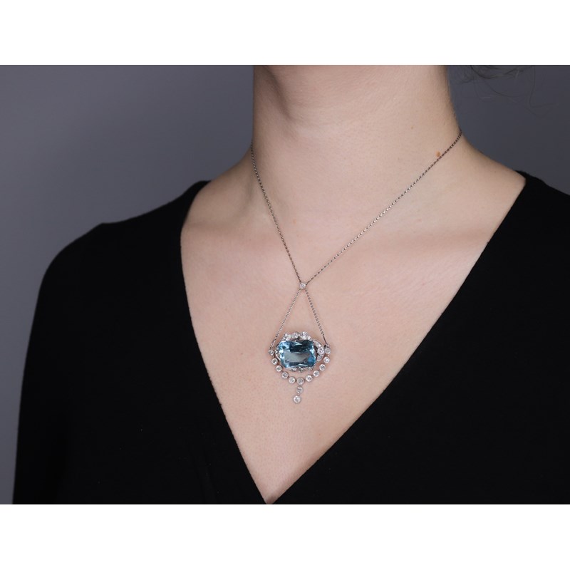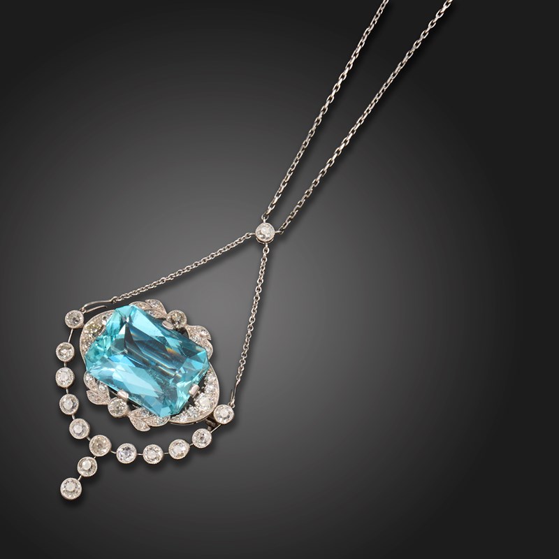 An aquamarine and diamond-set brooch pendant, the octagonal-cut aquamarine millegrain-set within a surround of circular-cut diamonds, suspending a swag further set with eleven circular-cut diamonds and two diamond drops, fine-link platinum neck chain mounted with a circular-cut diamond