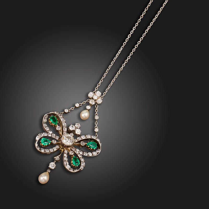 A 19th century gem-set butterfly pendant, centred with an old circular-cut diamond weighing approximately 0.55cts, set with further old circular-cut diamonds, four pear-shaped emeralds and suspending a natural pearl, set in silver on gold, folding pendant loop, detachable fine-link silver neck chain set with old circular-cut diamonds and a natural pearl, pendant 3.5cm high, chain 46cm long