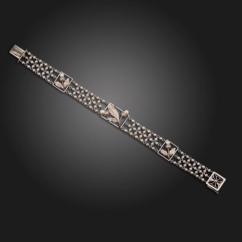 An Edwardian seed pearl platinum bracelet, the square links designed as oak leaves and acorns set with seed pearls, with seed pearl mesh connecting links, 16.5cm long