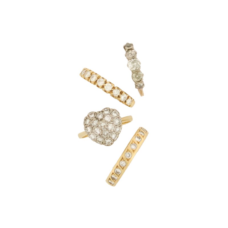 Four diamond rings, including an early 20th century five-stone ring set with circular-cut diamonds, stamped 18ct, size M, two hallmarked 18ct gold half eternity rings each set with nine brilliant-cut diamonds, sizes R and V, and a hallmarked 18 carat gold heart-shaped cluster ring set with brilliant-cut diamonds, size Q1/2
