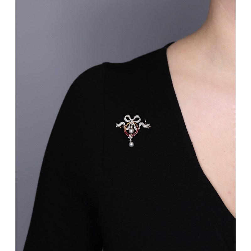 A Belle Epoque diamond, ruby and pearl brooch, designed as a ruby-set crescent supporting a diamond-set ribbon, suspending two untested pearls, 3cm wide