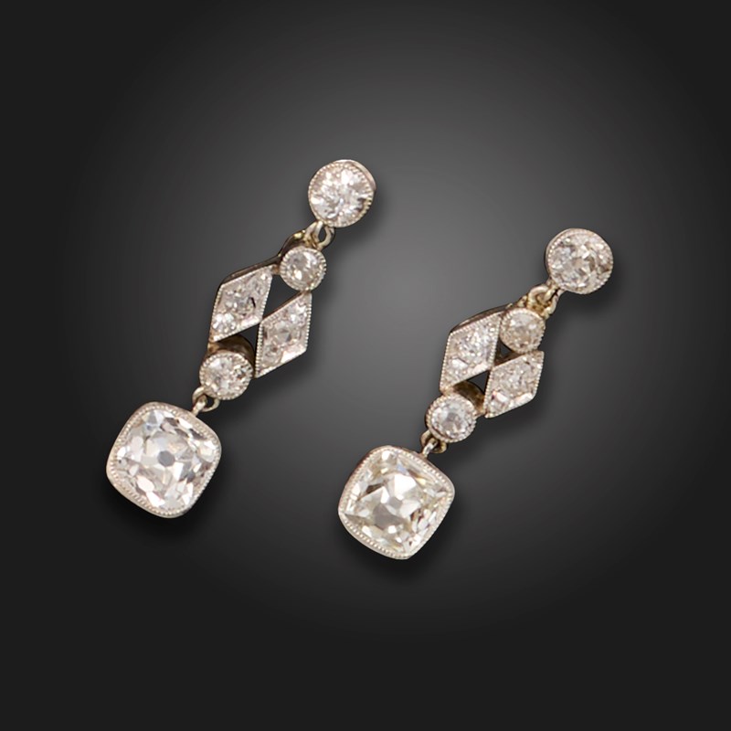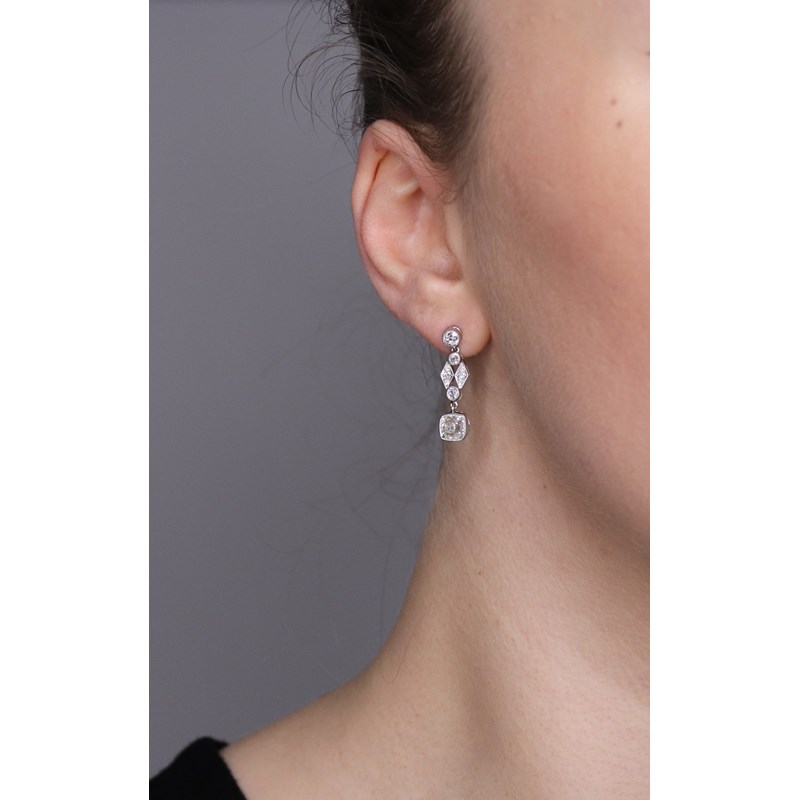 A pair of diamond drop earrings, each earring set with a principal old cushion-shaped diamond weighing approximately 0.75cts each, suspending from an articulated section set with old circular and single-cut diamonds in platinum, post fittings, 2.5cm high