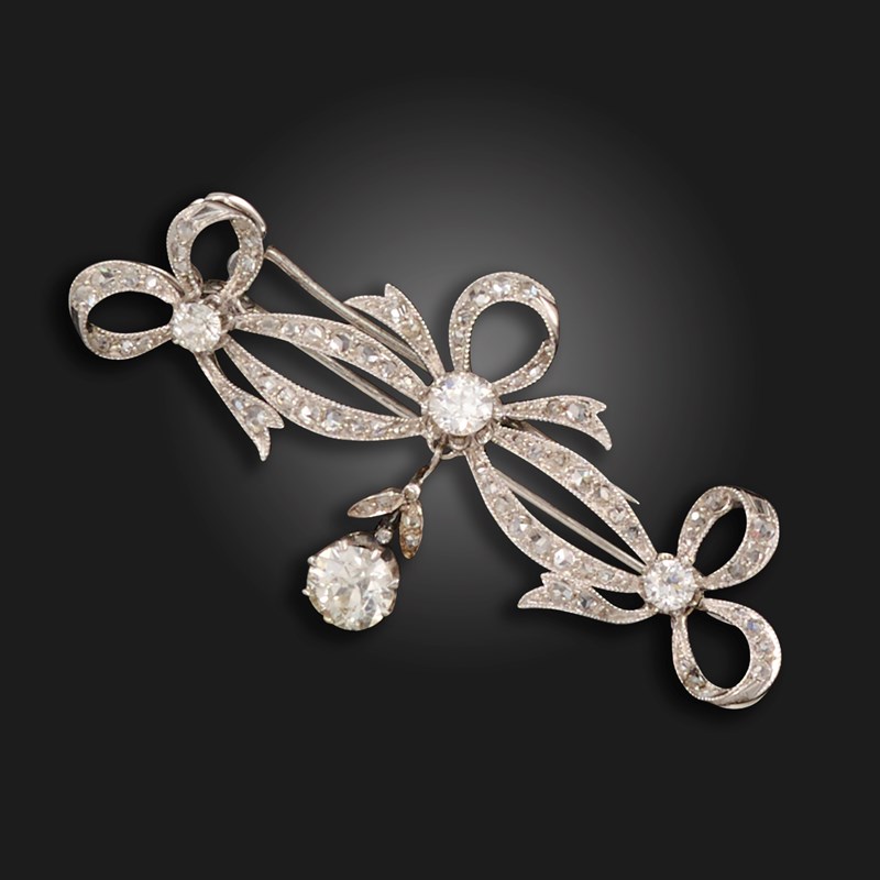 An early 20th century diamond bow brooch, the trio of bows set with rose-cut diamonds and each centred with an old circular-cut diamond, suspending a foliate drop set with an old circular-cut diamond weighing approximately 0.75cts, set in platinum, 5cm wide