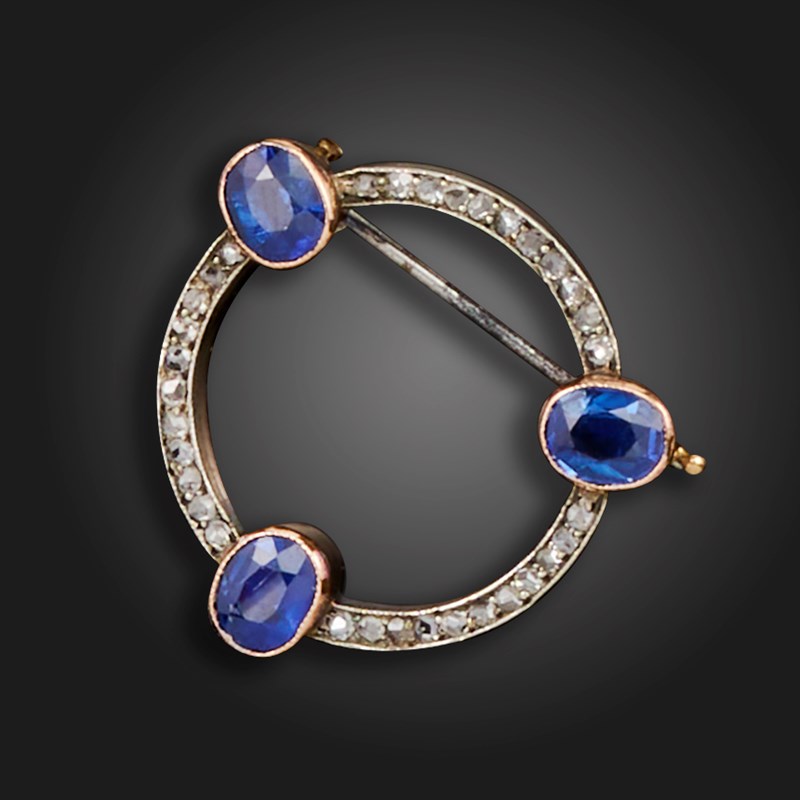 A Russian sapphire and diamond circular brooch, set with rose-cut diamonds and three oval-shaped sapphires in silver on gold, 56 zolotnik and St Petersburg mark, rubbed workmaster's initials, 2.5cm wide