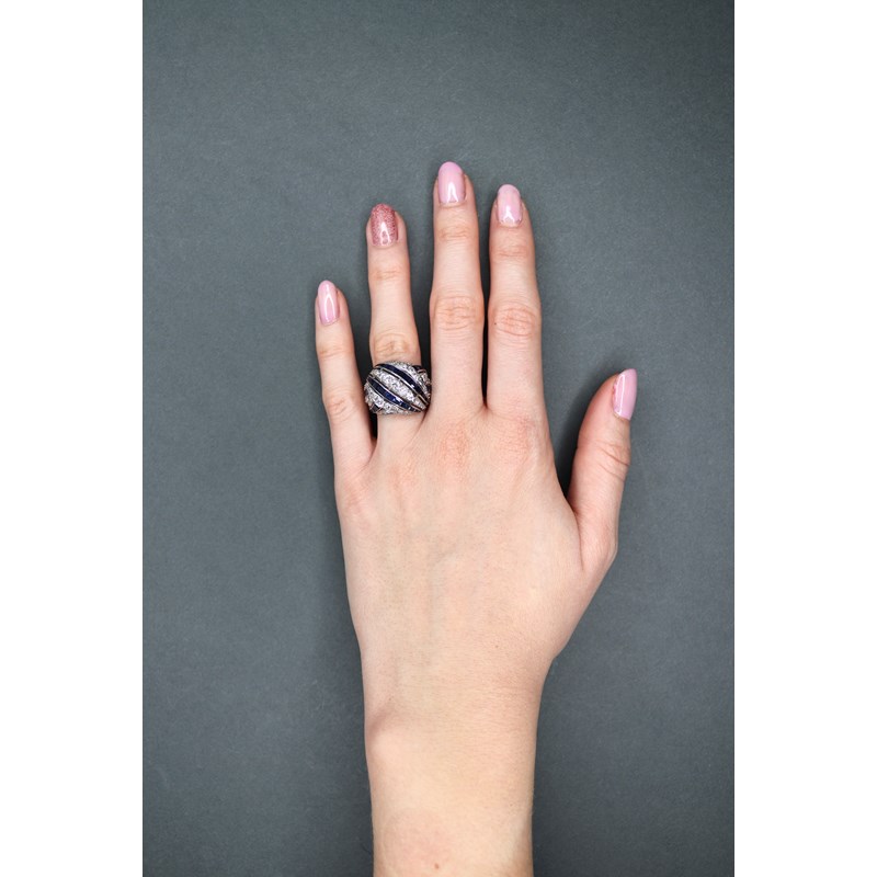 A diamond and sapphire bombé ring