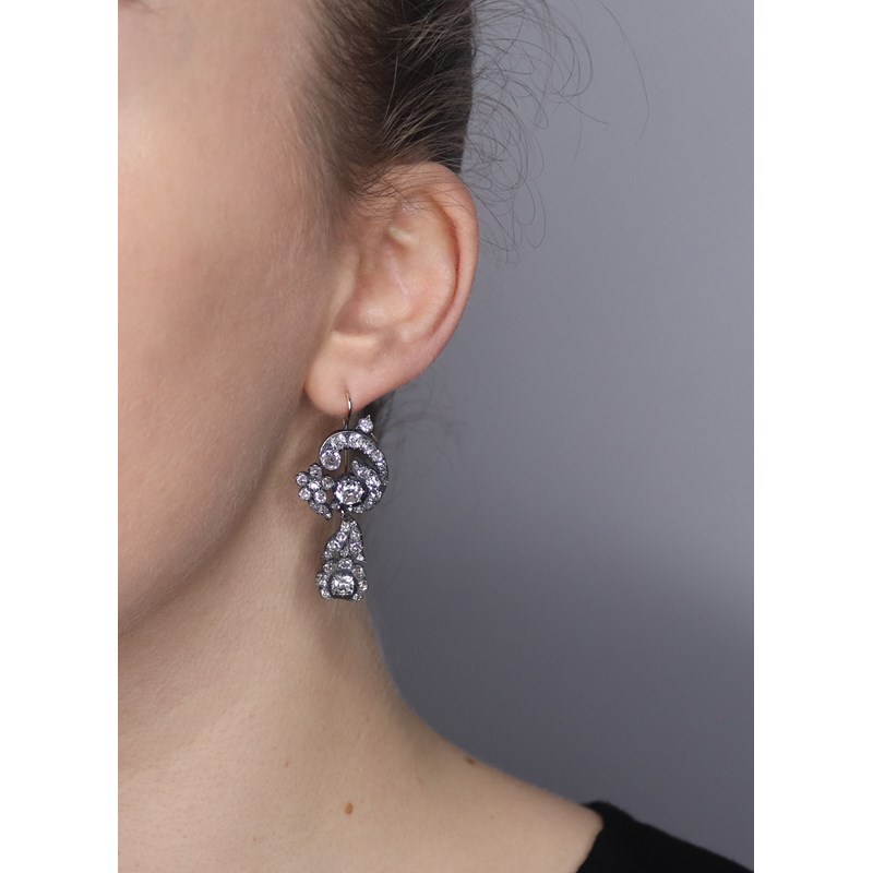 A late 19th century diamond necklace, the foliate scroll upper section centred with an old circular-cut diamond weighing approximately 0.99cts, suspending a detahcable foliate drop section centred with an old circular-cut diamond weighing approximately 0.60cts, set overall with old cushion-shaped diamonds in silver on gold, on a later fine-link silver neck chain, necklace 38cm long
