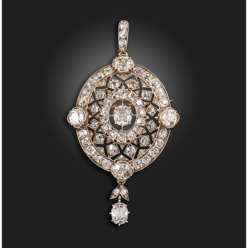 A late Victorian diamond pendant brooch, set with a central old cushion shaped within concentric borders of smaller diamonds pierced with a starburst design and a further surround of diamonds quartered with larger diamonds, suspended from detachable diamond-set pendant loop, and suspending an oval diamond drop, in silver and gold, 6cm high total
