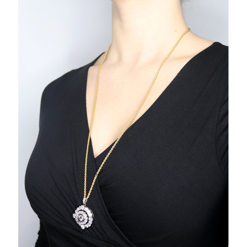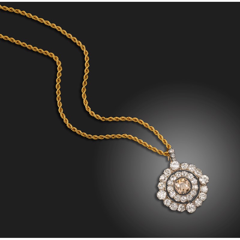 A 19th century fancy diamond and white diamond target pendant, centred with an old cushion-shaped fancy-coloured diamond, within a double surround of graduated old cushion-shaped diamonds, quartered with four large old circular-cut diamonds, with a detachable diamond-set bail, set in silver on gold, on a later ropetwist gold chain necklace, pendant 4cm high, necklace 72cm long