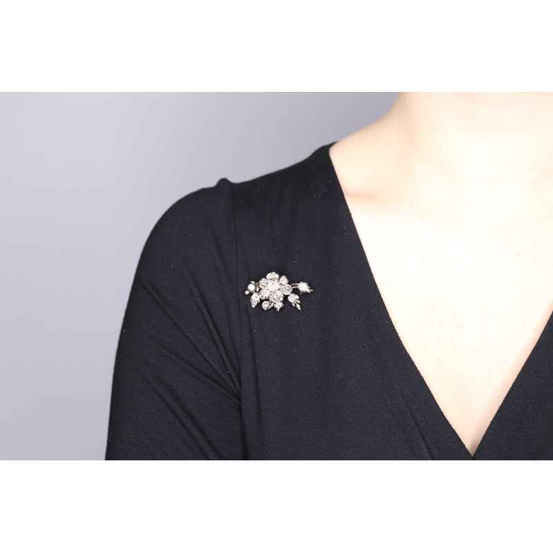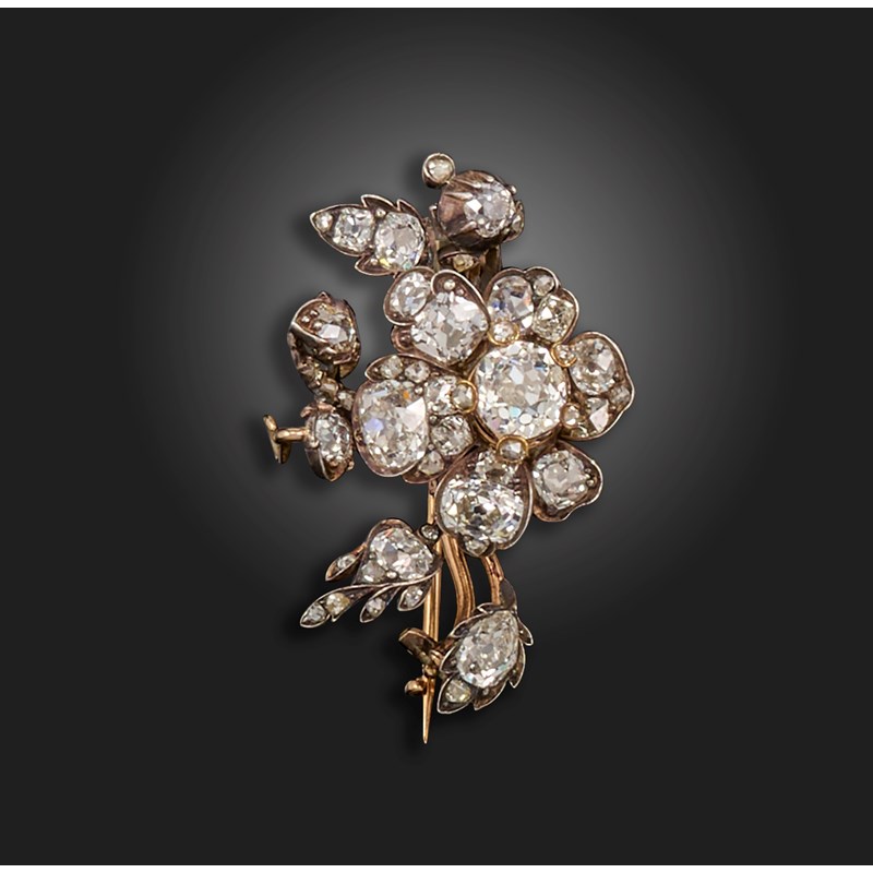 A 19th century diamond foliate brooch, set overall with graduated cushion-shaped diamonds in silver and gold, 3.5cm wide