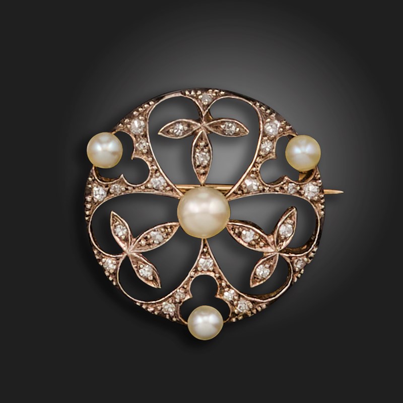 An early 20th century pearl and diamond brooch, of circular outline with open work designs of trefoils in the gothic style, set with pearls and single-cut diamonds, pearls untested, 2.5cm diameter