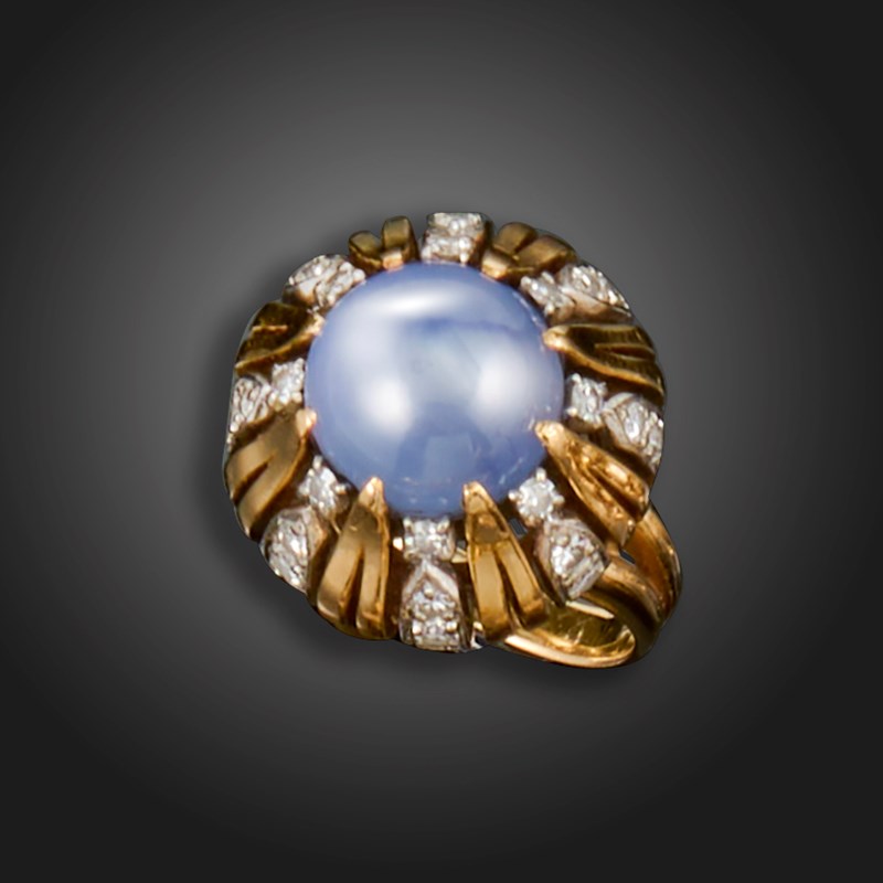 A star sapphire and diamond ring, set with a circular star sapphire cabochon, the openwork surround alternately-set with single-cut diamonds in silver and gold, gold shank stamped 18K, size M