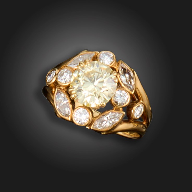 A fancy coloured diamond ring by Chaumet, the old circular-cut fancy yellow diamond is set within marquise-shaped and circular-cut diamonds, with further diamond shoulders in yellow gold, French control marks and makers lozenge, signed Chaumet Paris, 750, size N 1/2