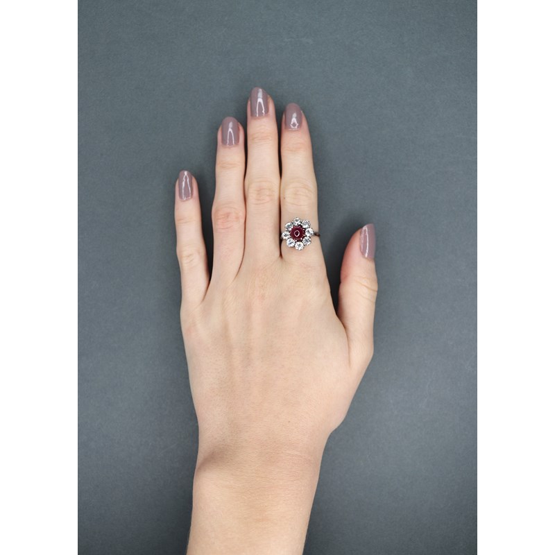 A ruby and diamond cluster ring, the ruby cabochon is set within a surround of old circular-cut diamonds in silver on gold, size N