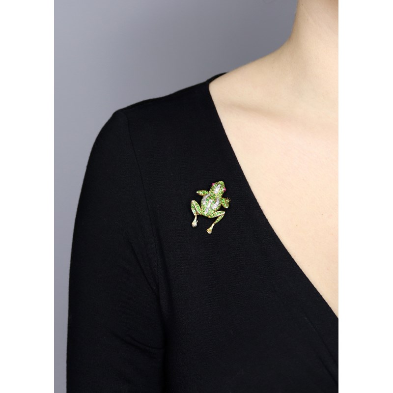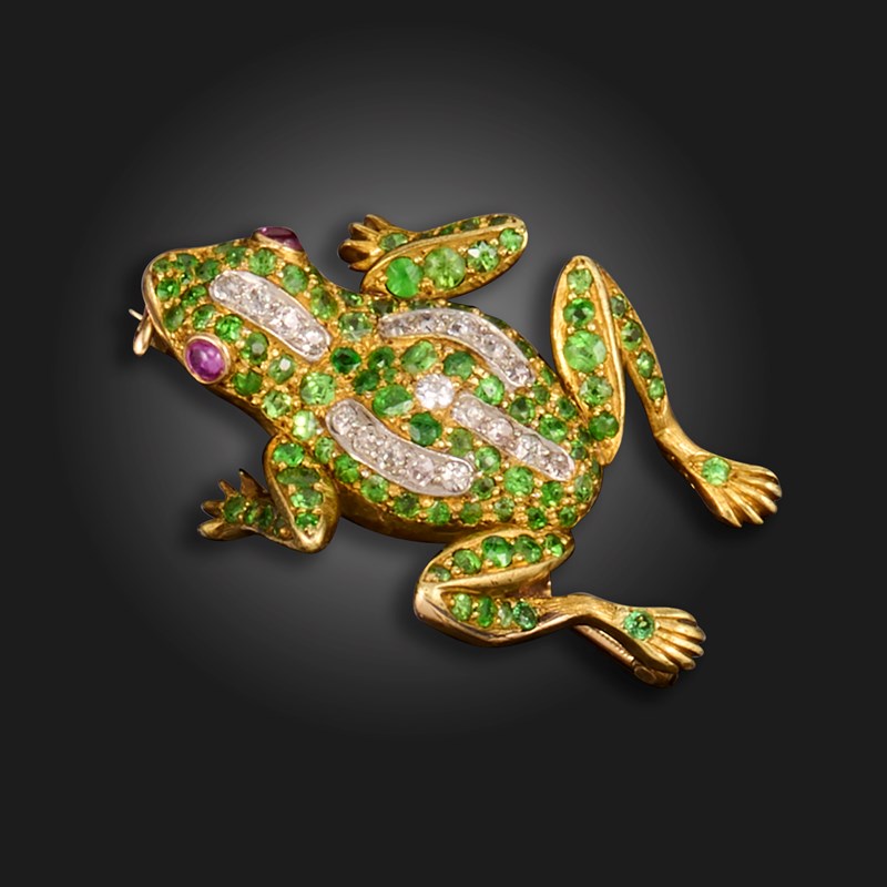 An early 20th century gem-set gold frog brooch, set with demantoid garnets and diamonds with cabochon ruby eyes, 3.8cm long