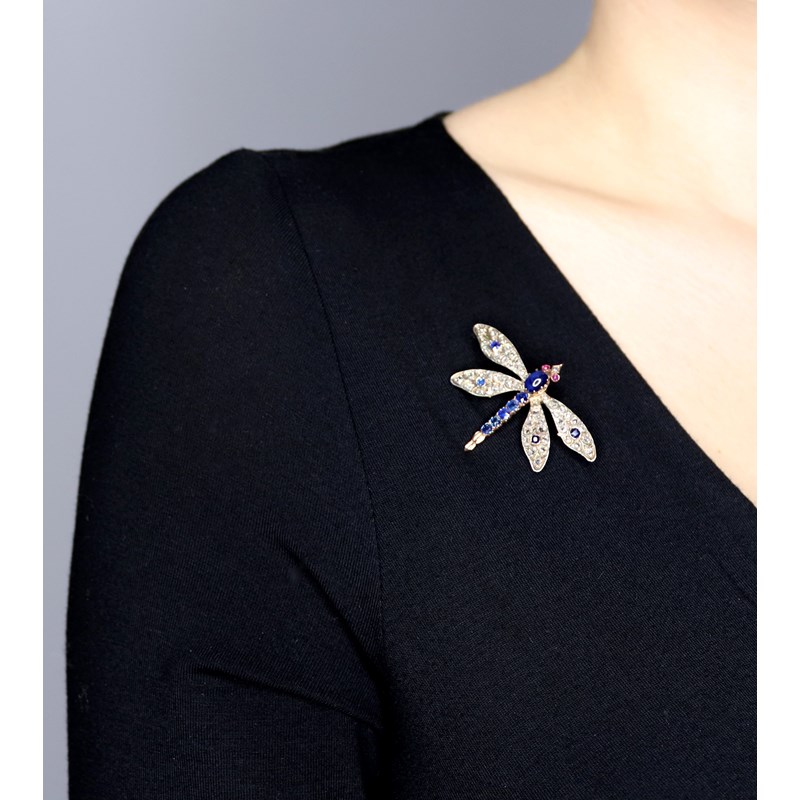 A late Victorian gem-set dragonfly brooch, the body set with a cabochon sapphire and graduated cushion-shaped sapphires, with ruby eyes and pave-set sapphire and rose-cut diamond wings, in silver and gold, 5cm wide